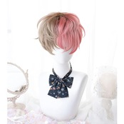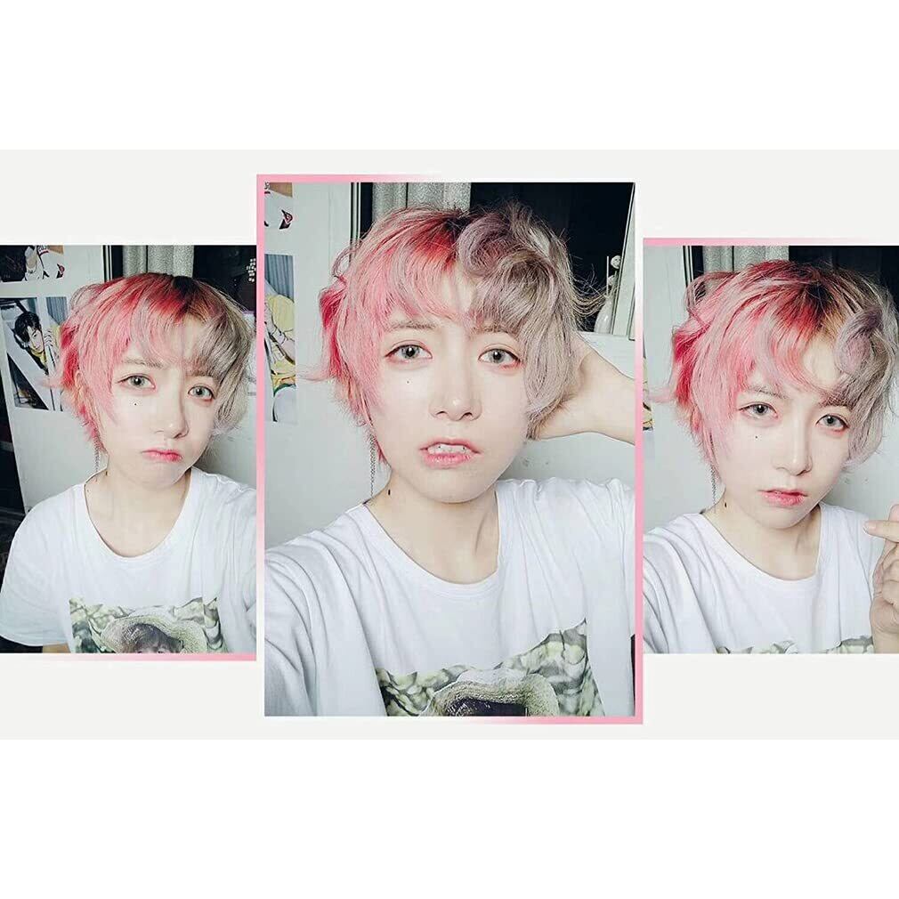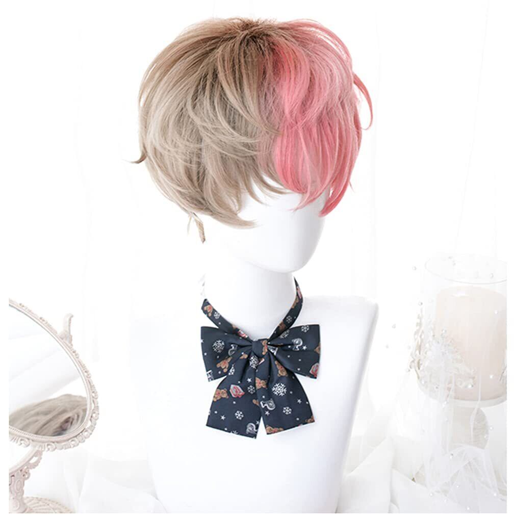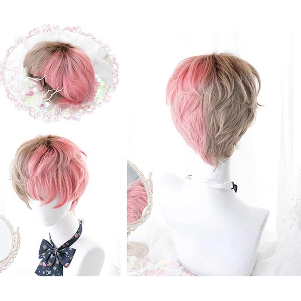 ウィッグ メンズ コスプウィッグ 耐熱 左右色違い (茶色 ピンク) メッシュ ショート 巻き髪 男女 森ガール ゆめかわいい 小顔 パーティー 仮装 日常 かつら wig