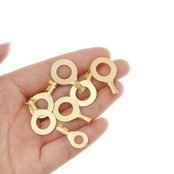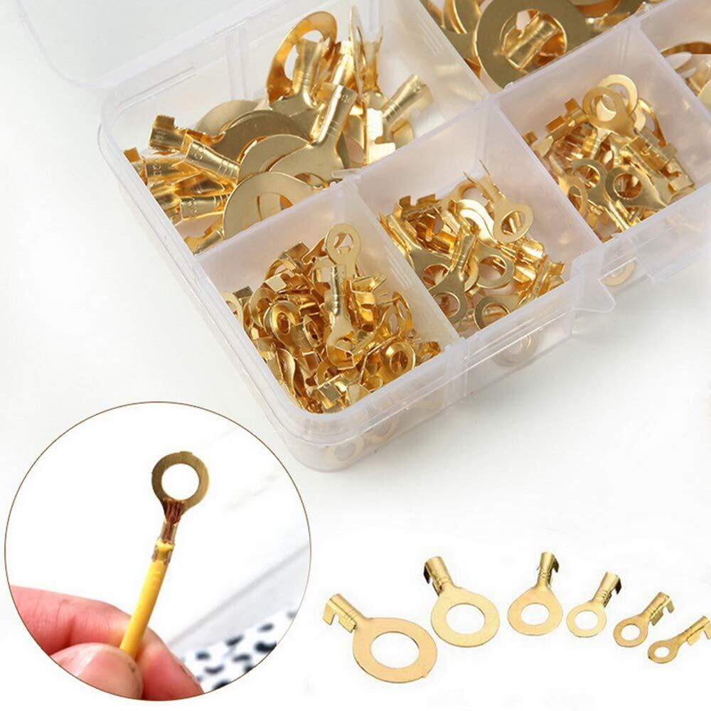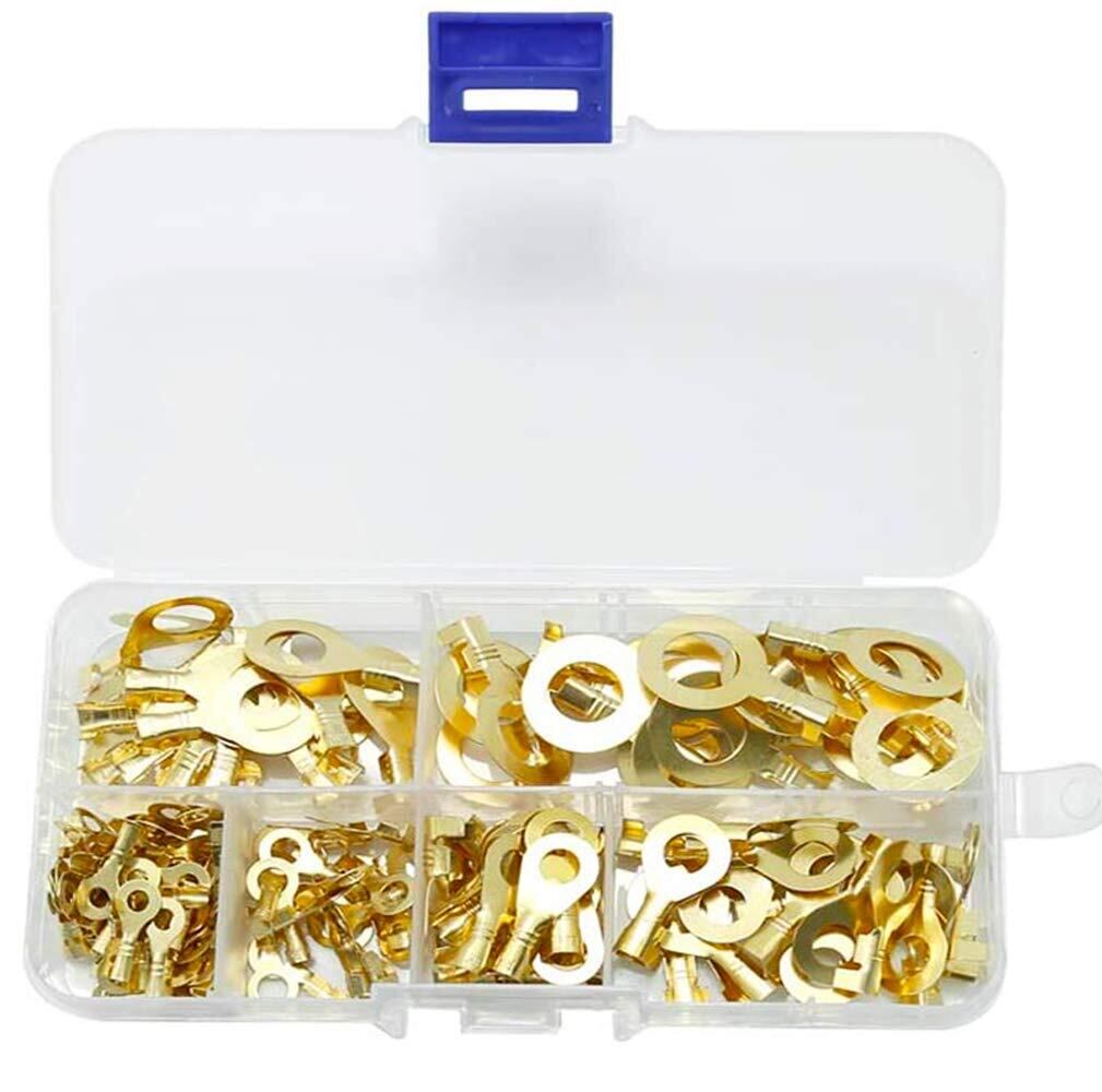 4.こ透明なボックスに入れた6種類の丸端子です。端子を整理して分類し、持ち運びや取り出しが容易になります。カラー:ゴールド。
