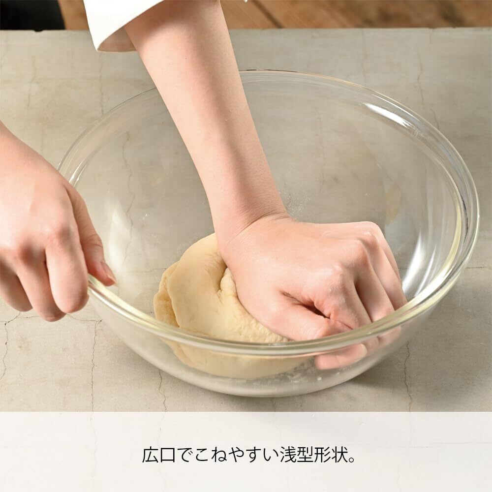 浅型の広口設計なので、こねたり混ぜたりなどの下ごしらえがしやすく、電子レンジやオーブンの調理ができる耐熱ガラス製です。サイズ違いのボールは入れ子収納ができるのでスッキリと置くことができます。