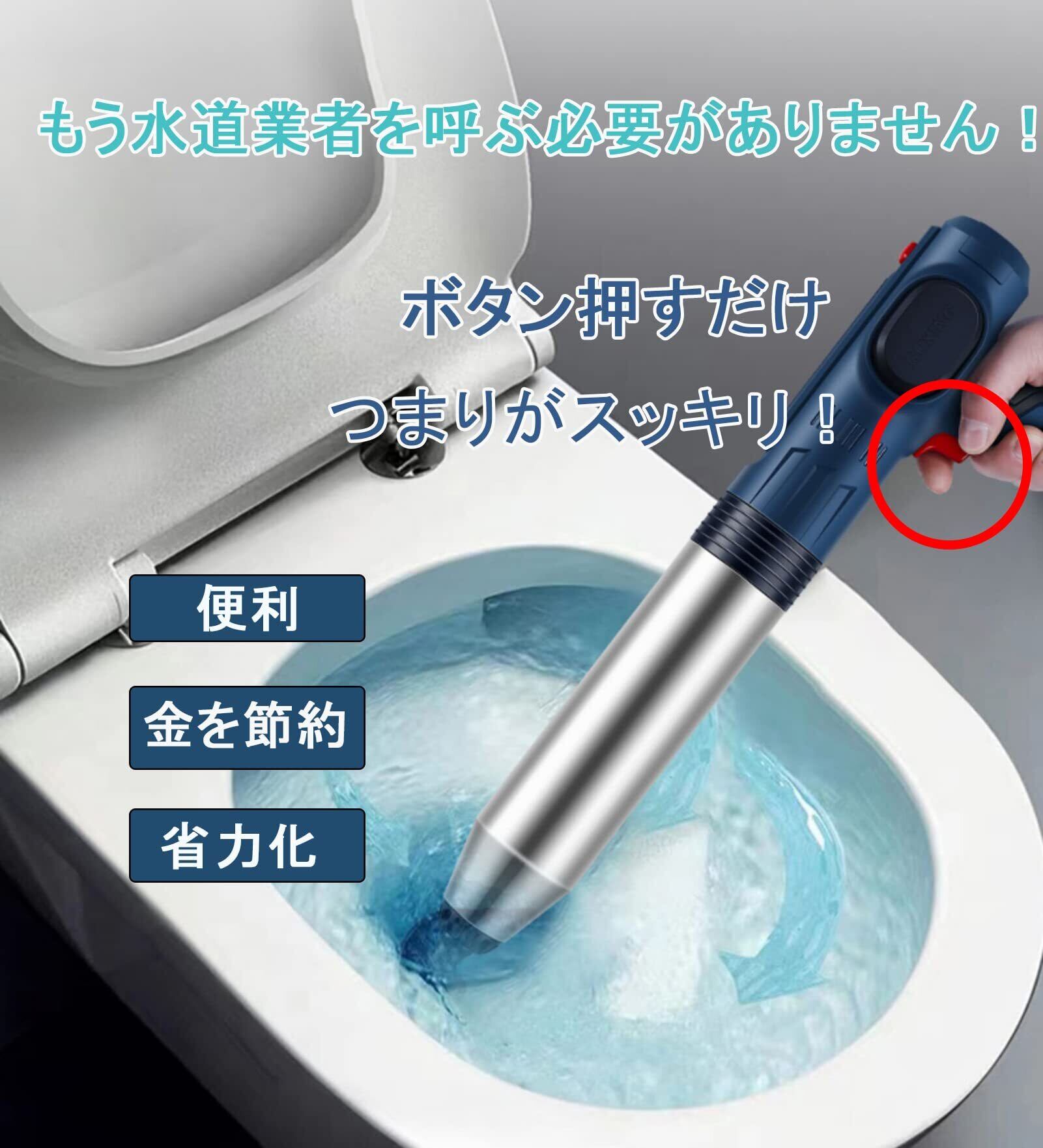 【電動式が簡単で使いやすい】従来の手動タイプと比較して、手動加圧は不要で、より効率的で便利であり、ボタンを押して自動でき空気の圧力を高めて、また簡単にボタンを押すだけでつまりが解消でき、指先だけでつまり解消動作ができます。力弱いの年寄りまた女性も手間をかけずに手軽くご使用いただけます。