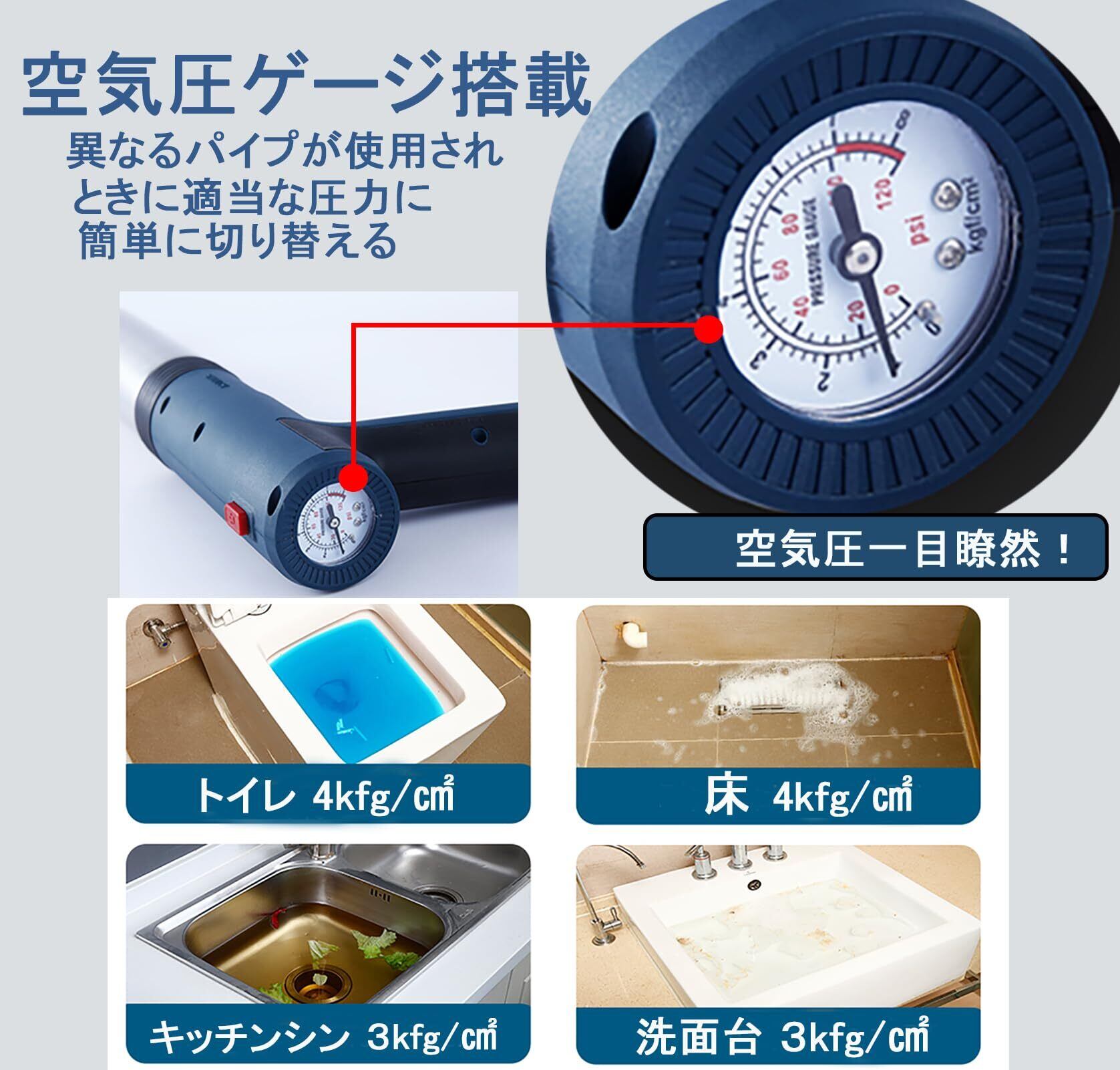 【頑固なつまりがスッキリ】圧力計が付いてる本格的なパイプクリーナーです。空気を任意の圧力まで圧縮してから、適当な圧力で止めて一気に放出します。頑固なつまり一発に解消することに役立ちます。ワンタッチでつまりを解消でき、圧力値を切り替えることにより、異なるパイプのつまり解消に適用することができます。お財布に優しい。もう水道業者を呼ぶ必要がありません。これ一つで問題を解決!時間とお金を節約することができます。