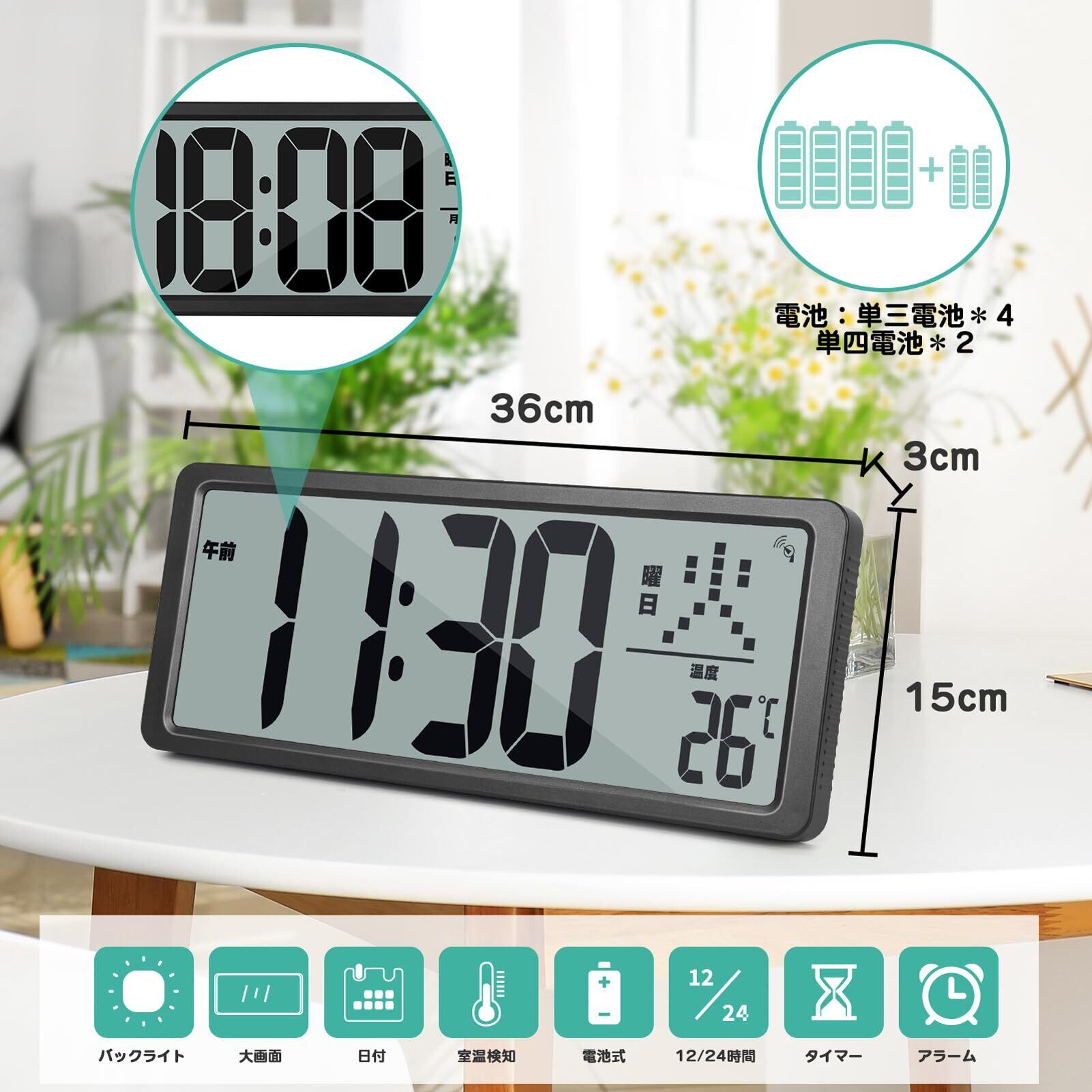 2.【デジタル時計 壁掛け 大型】サイズ:36×15×2.3cm、超大な文字盤。対比度が高くてはっきりと見える超大の数字は、いかなる視点から読むことができます。当該デジタル時計は時刻、曜日、温度、月と日付を表示することができ、はっきりとして快適な視覚体験をお届けします。掛け・置き両用、電池から給電するから、任意の位置調整が可能となります。