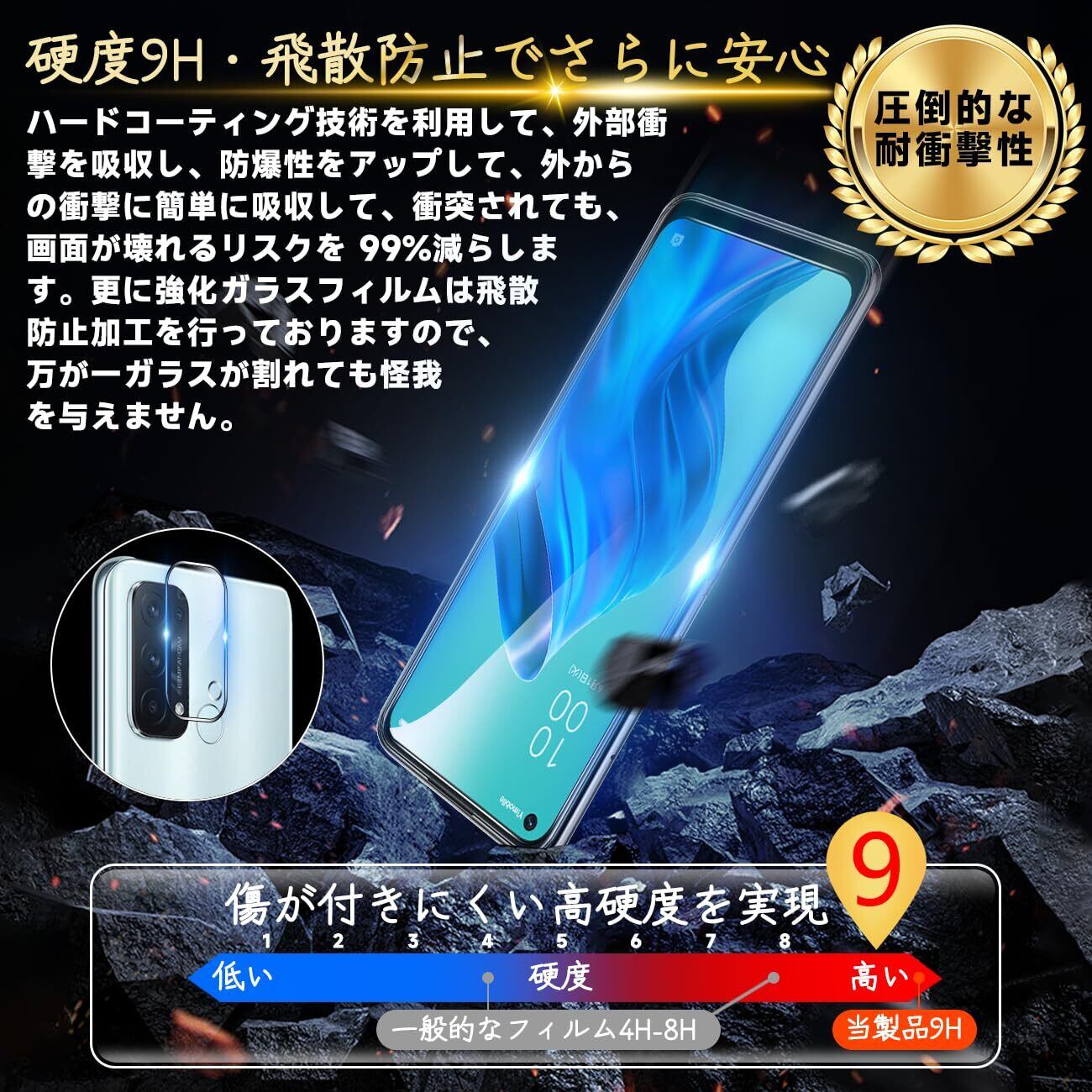 【高品質の材料の9H硬度】とレンズ保護フィルムはすべて旭硝子で作られており、スマホ保護フィルムの中で最高レベルの9H硬度に達しています、4.5時間以上の高温焼入れ処理を行い、スクリーンプロテクターの圧強度は 125mpa に達し、通常 ガラス の 5 倍になりました。しかもスクリーンプロテクターは衝撃を抑えるシリコンコーティングを内蔵しており、万が一ガラスが割れても、ガラスの破片が飛散しません。ハードコーティング技術は、衝撃を最小限に抑えて画面の破損を抑え、すり傷防止や指紋防止もしっかりとスクリーンを保護します。*大切な携帯電話の液晶画面を保護し、衝撃や表面のキズを防止します。