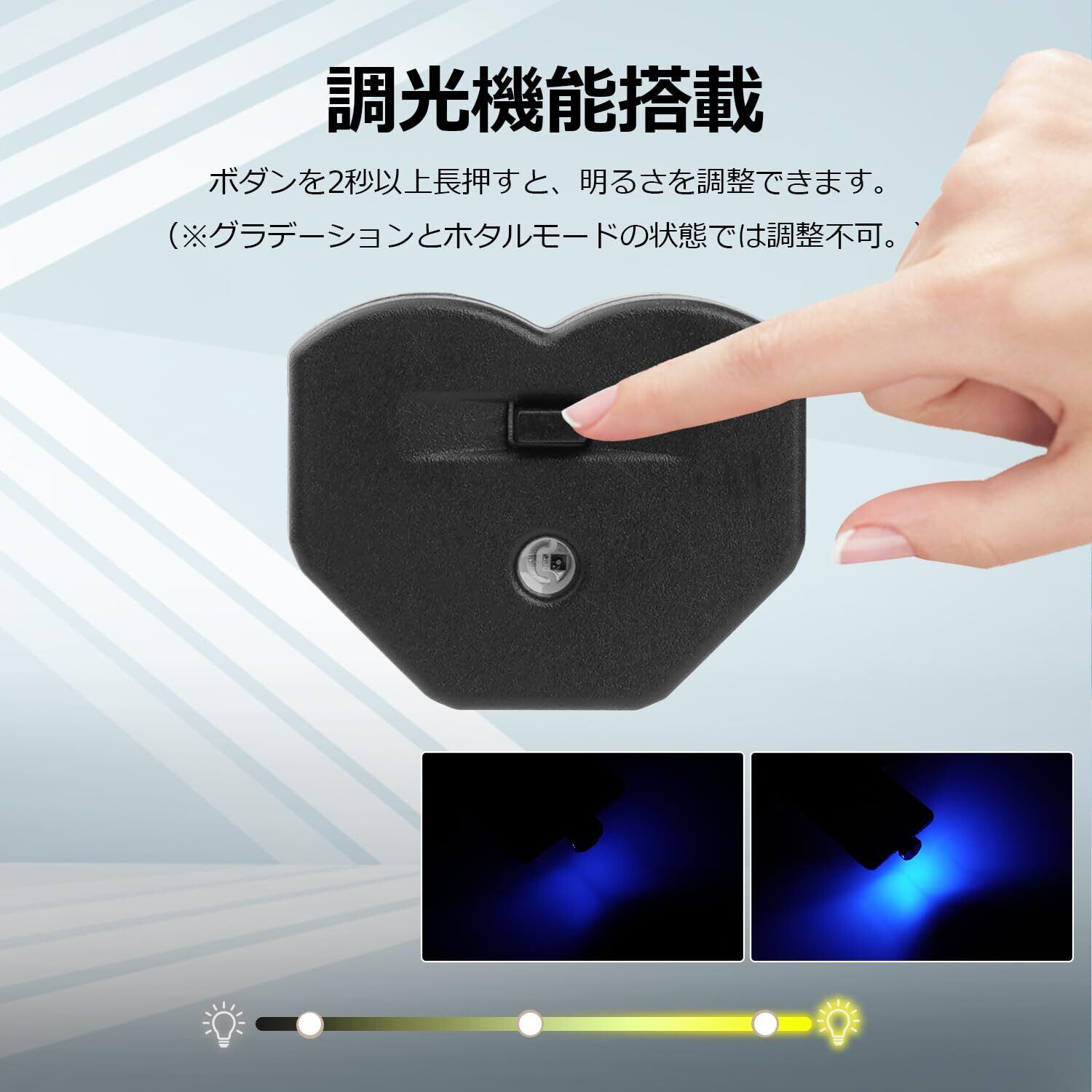 3.【3種類の点灯モード&メモリー機能】①単色・グラデーションモード:ボタンを1回押すと、8色とグラデーションを切り替えます。②ホタルモード:ボタンを2回押すと、ふわっと点灯・消灯を繰り返します。「ホタルモード時にボタンを2回押すと、常時単色点灯に戻ります。」さらに、カラー記憶プログラムを搭載することにより、エンジン再始動後に前回設定カラーで点灯しくれます!面倒な再操作が不要でとても便利!