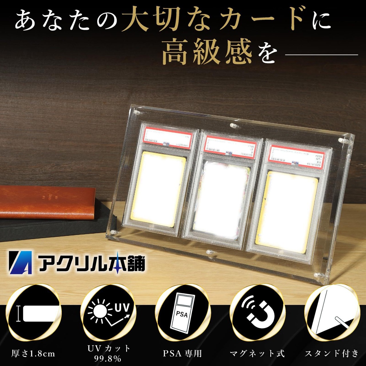 【UVカット率99.8%】アクリル本舗 PSA用 スクリューダウン 3連 マグネットローダー psa CGC 対応 ディスプレイ ケース スタンド 付き 鑑定 展示 保管 収納 厚さ1.8㎝の高級仕様 (PSA3枚用_クリア, マグネット式)