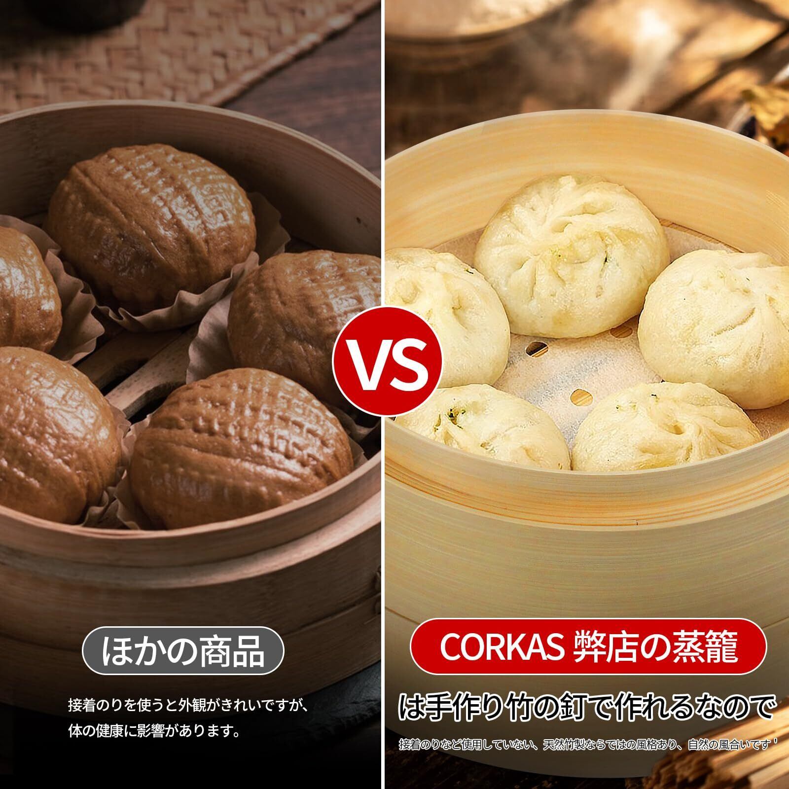 【天然竹製,接着のりなど使用していない】CORKAS弊店の蒸籠は手作り竹の釘で作れるなので、接着のりなど使用していない、天然竹製ならではの風格あり、自然の風合。ほかの商品接着のりを使うと外観がきれいですが、体の健康に影響があります。