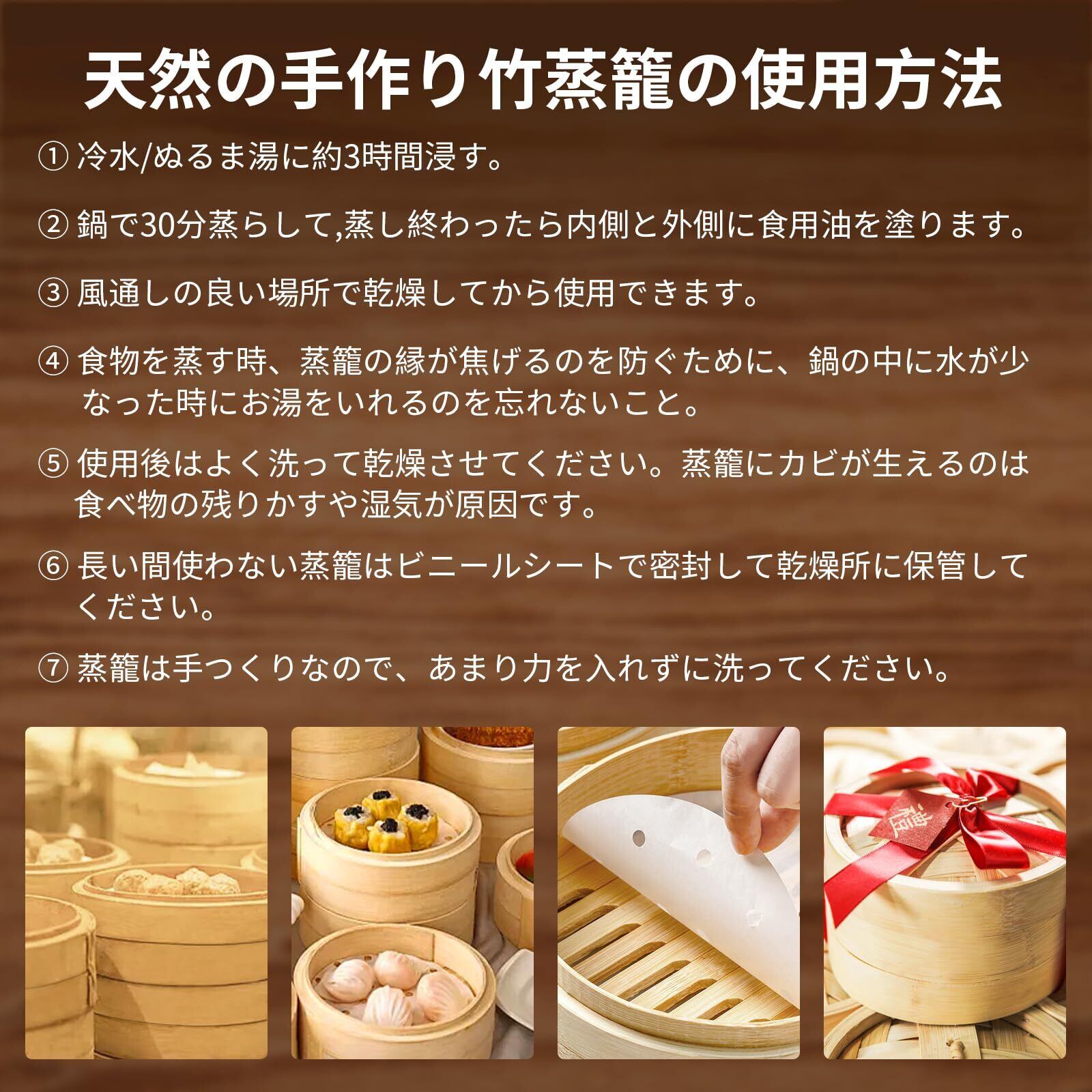 【ペーパー(蒸篭専用用紙)】内底に食材の汁が直接付くのを防ぐ、直置きによる汚れを防ぐ、注)汚れを完全に防ぐものではありません。蒸篭用紙は日本国の食品衛生法に基づき一般財団法人東京顕微鏡院食と環境の科学センター豊海研究所にて輸入食品等試験成績証明書(東顕食発 第 0062207-0057 号)を取得していますので安全に安心してご使用いただけます。