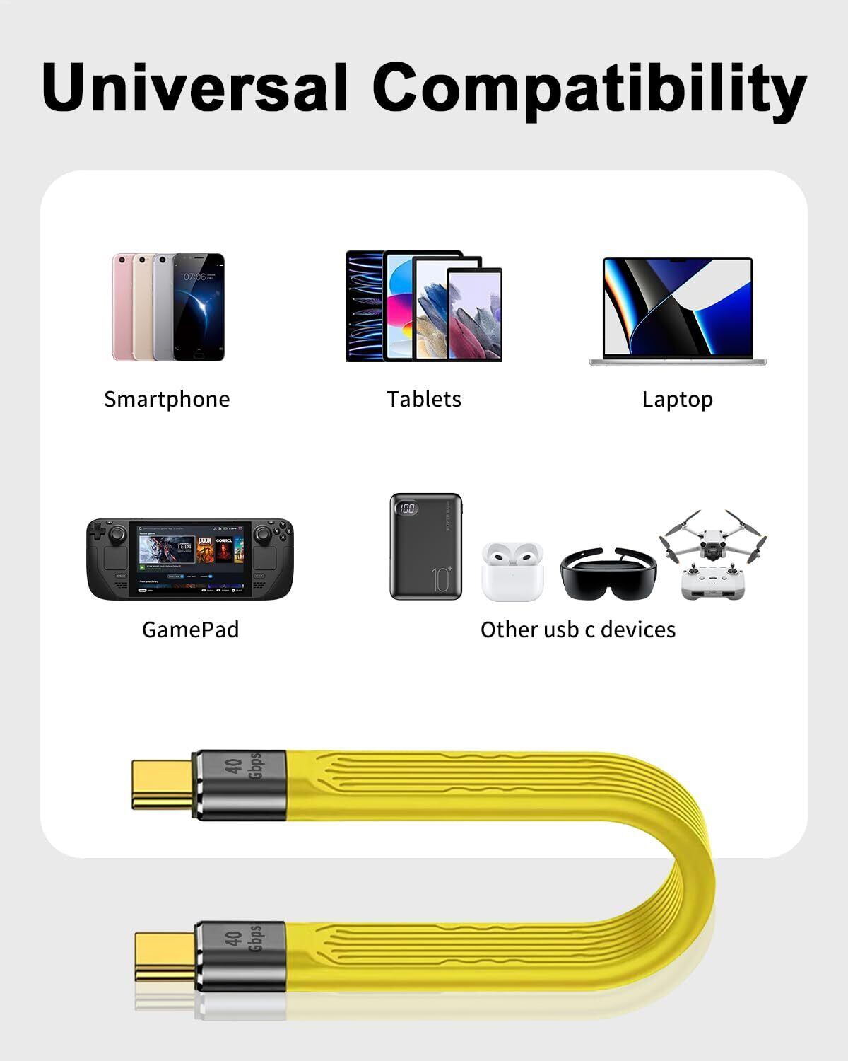 USB Type C 充電ケーブル短いは40Gbpsのデータ同期転送をサポートし、お気に入りの映画、音楽そしてを数秒で転送できます。Type Cハードドライブ、ポータブルSSD、macbook、アンドロイドオートPCラップトップ、タブレット、テレビ、モニター、スマートフォンなど、ほとんどのUSB Cデバイスに対応しています。