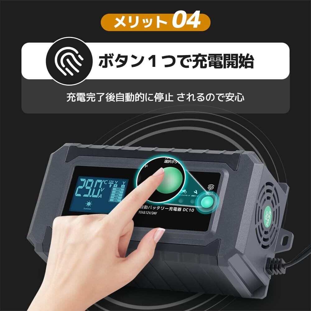 LVYUAN(リョクエン)自動「パルス充電」バッテリー充電器 定格10A 緊急時全自動 スマートチャージャー 12V/24V対応 バッテリー診断機能付 AGM/GEL車充電可能 バイク ・自動車・農機・建設機械・小型船舶など 日本語説明書 DC-10 温度感知モード 冬満充電を確保
