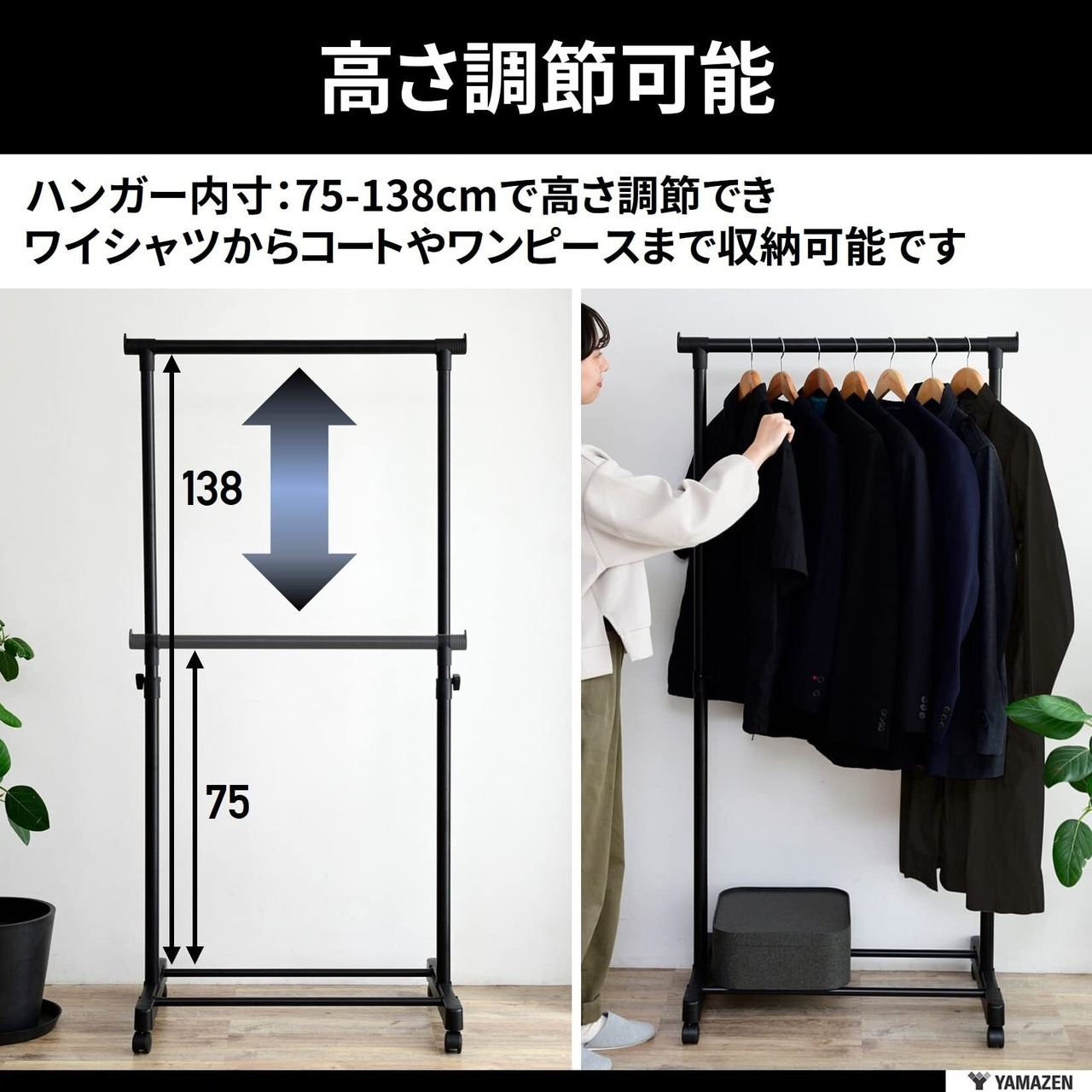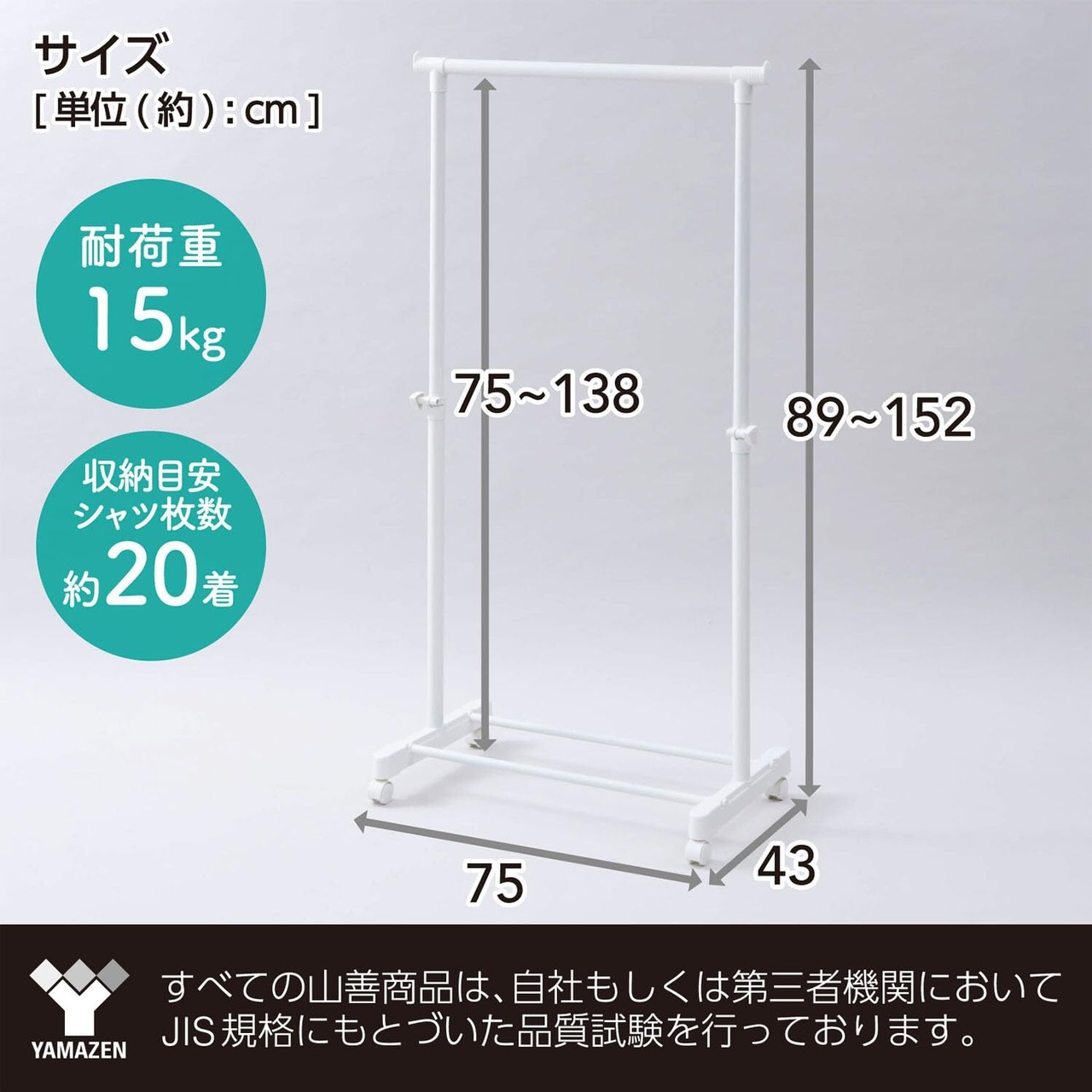 ●本体サイズ:幅75×奥行43×高さ89-152cm●ハンガーバーの下部からベース用パイプまでの距離:75-138cm●耐荷重:15kg●材質:構造部材/金属(スチール)・ポリプロピレン、表面加工/エポキシ樹脂塗装●お客様組立品(かんたん組み立て)●東証プライム(株)山善で扱うすべての山善商品は、自社もしくは第三者機関において、JIS規格に基づいた品質試験を行っております。