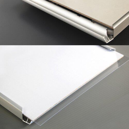 アルミ製の軽量前開き式フレーム。一辺のフレームを開くだけで作品の交換が可能。フレーム色は控えめなツヤ消しゴールドです。