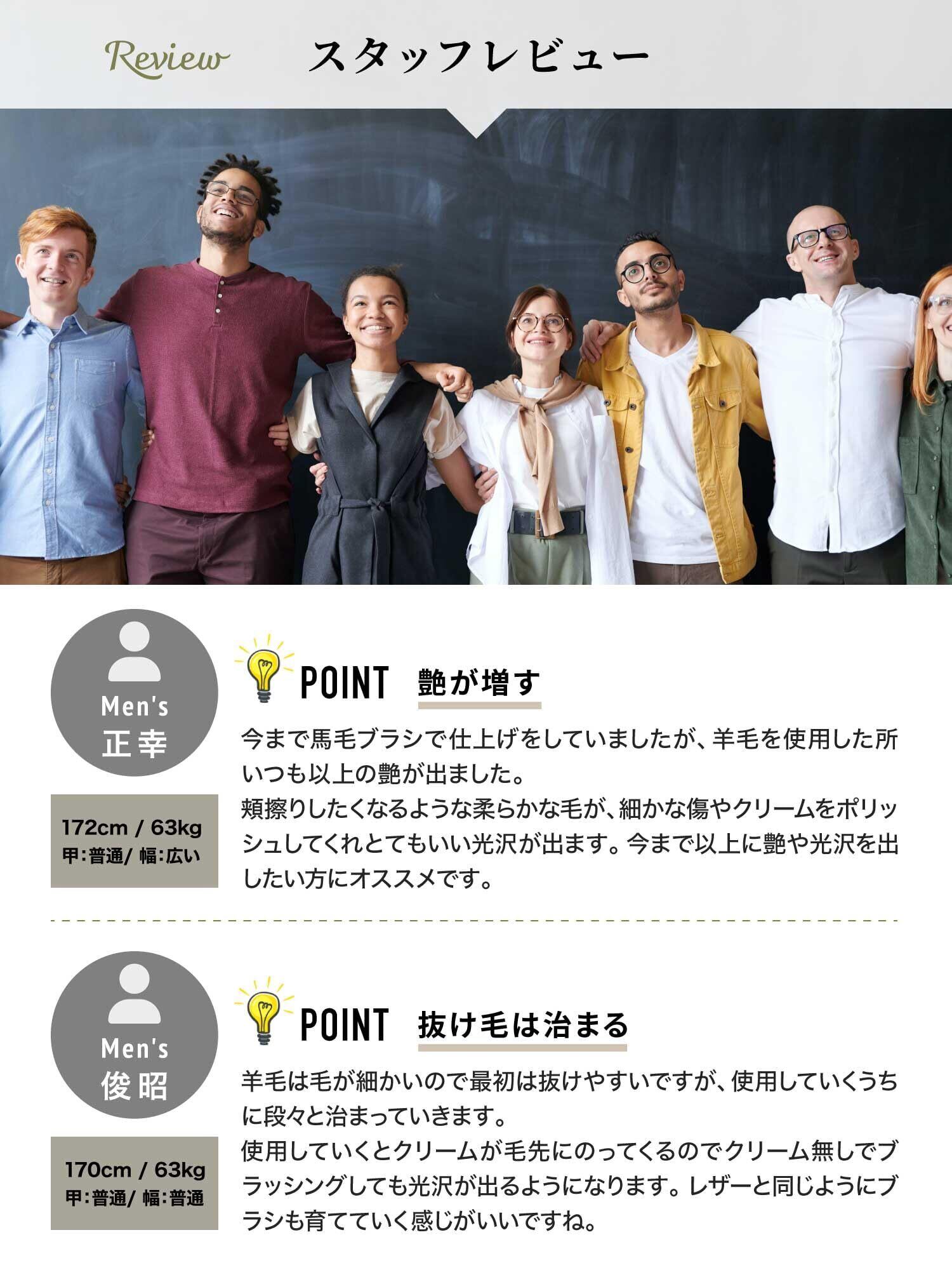 【 繊細な素材にオススメ 】コードバンのような傷が付きやすい素材に豚毛や馬毛ブラシを使ってしまうと傷がついてしまう事があります。毛が細く柔らかい羊毛ブラシがオススメです。