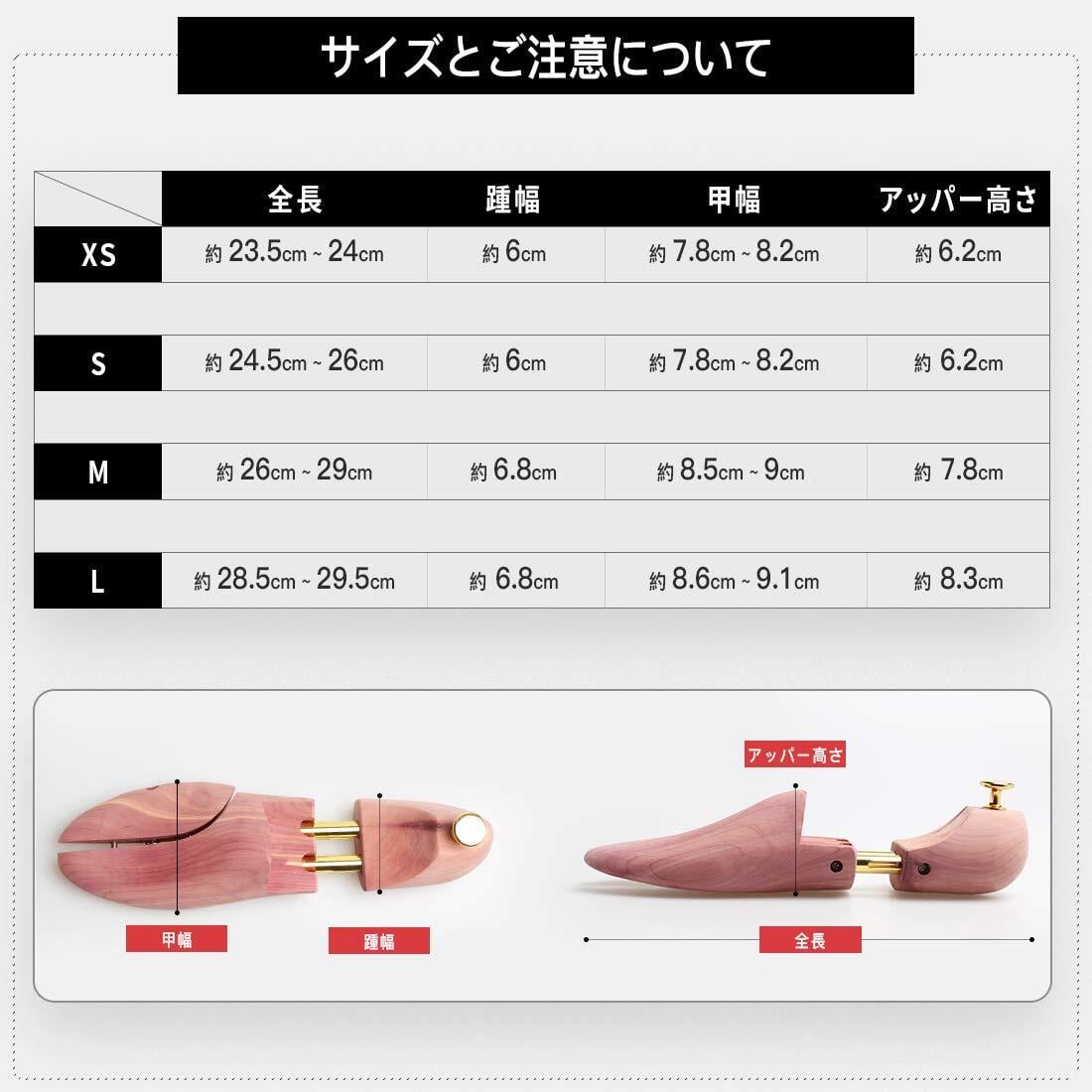 シューキーパーは天然木を使用して手作業で作成される部分もあるため、モノによって木目や色味が違っていたり天然木傷が見られる場合がございます、形にも多少個体差がございます。予めご了承くださいますようお願い致します。サイズを選択の場合は3箇所(全長、アッパー高さ、踵幅、甲幅)の実測によって購入するようお願いします。サイズ表と実測した寸法を合わせて、ご確認の上、ご購入ください。【サイズについて】Sサイズ全長約24.5-26cm、アッパー高さ約6.2cm 、踵幅約6cm 、甲幅約7.8-8.2cm Mサイズ全長約26-29 cm、アッパー高さ約7.8cm 、踵幅約6.8cm 、甲幅約8.5-9.0cm ※26cmMサイズをお勧めいたします。