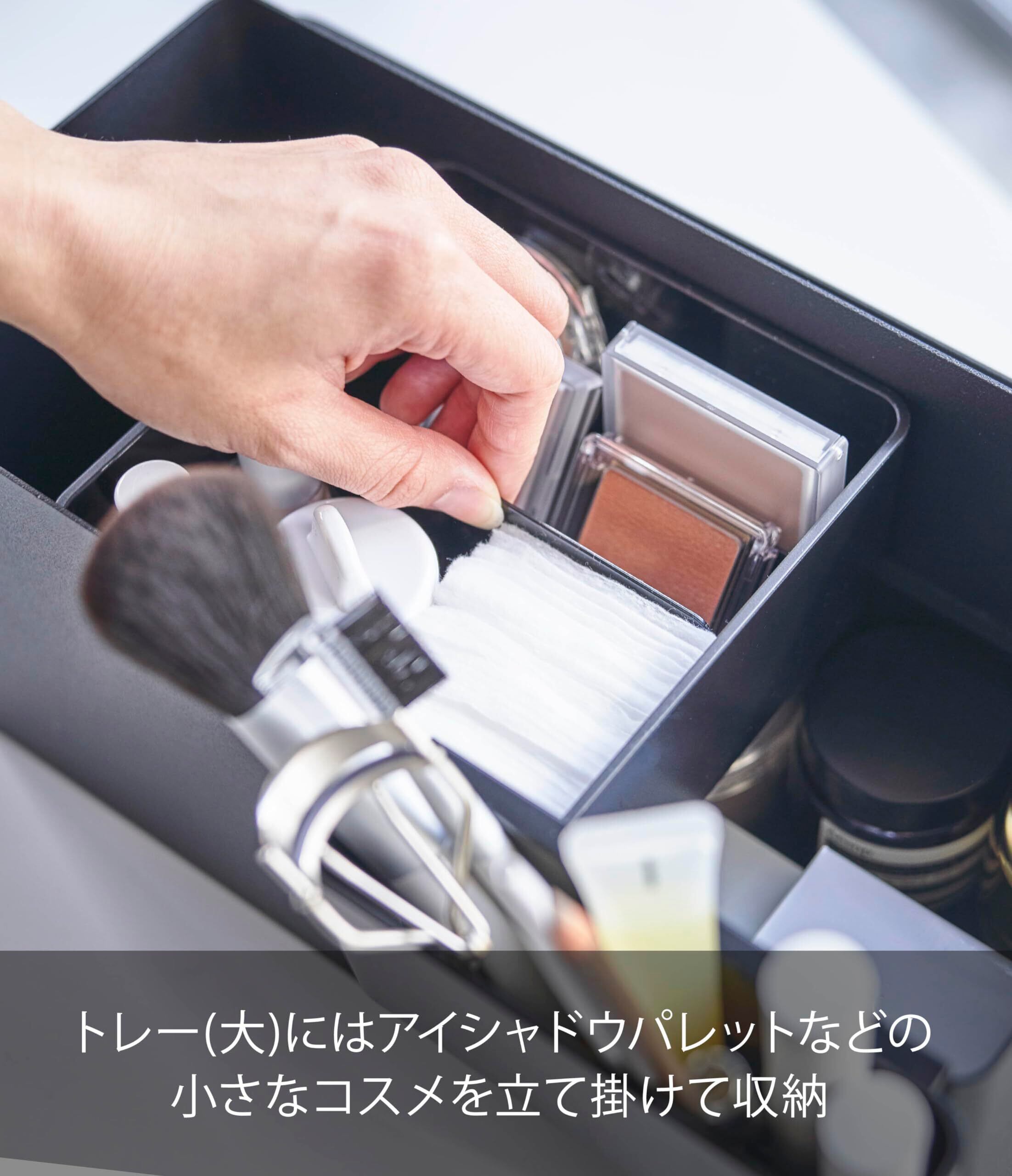 パレットなどの小さなコスメを立て掛けて収納できるトレー(大)とペンなどの細長いコスメを立てて収納できるトレー(小)が付いています。