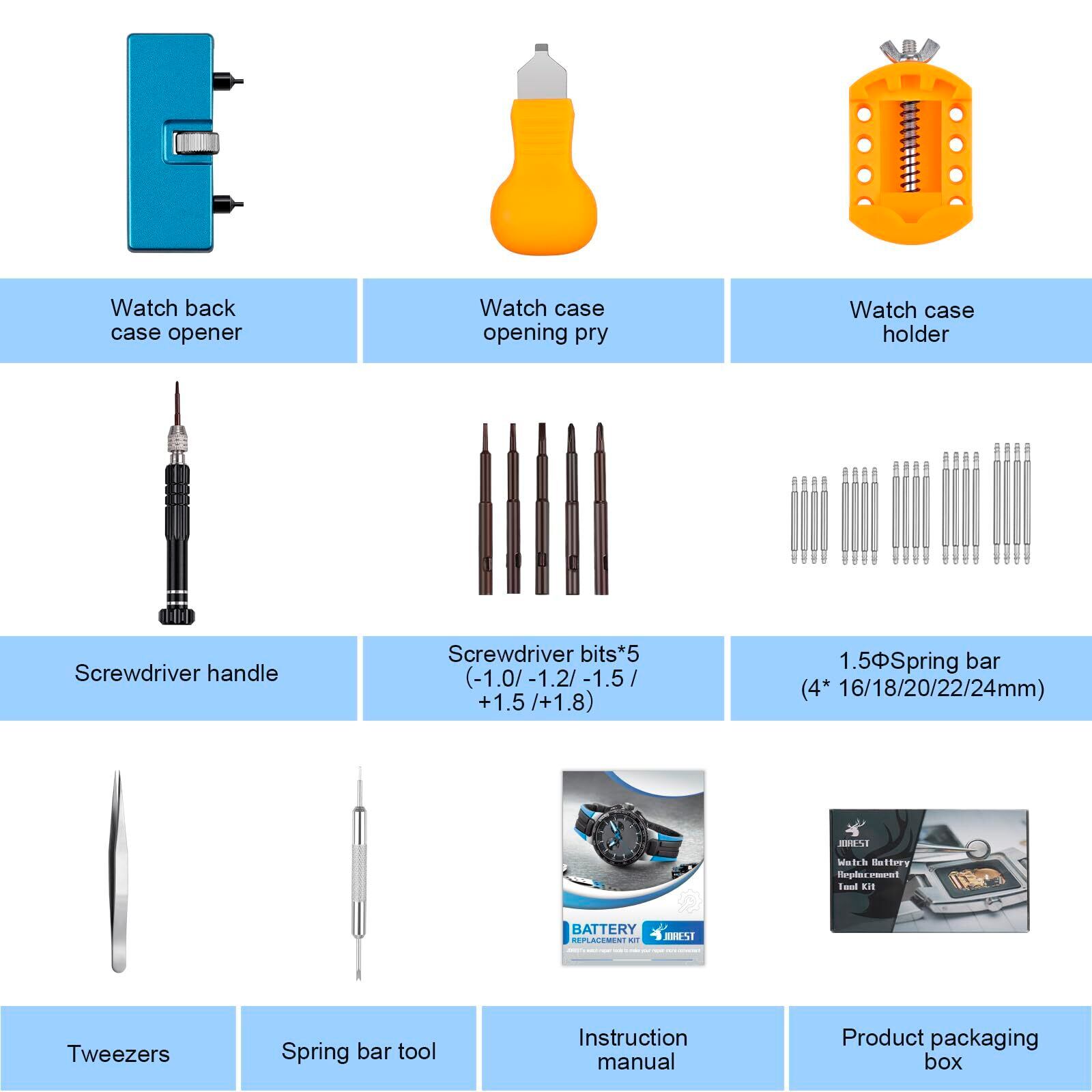 【JOREST】腕時計 電池交換 工具、時計工具セット、 時計バンド/ベルト 交換工具、時計の裏蓋オープナー、 時計修理、時計アクセサリー、時計 裏蓋 外し 工具、スプリングバー、ピンセット、取扱説明書(英語版)