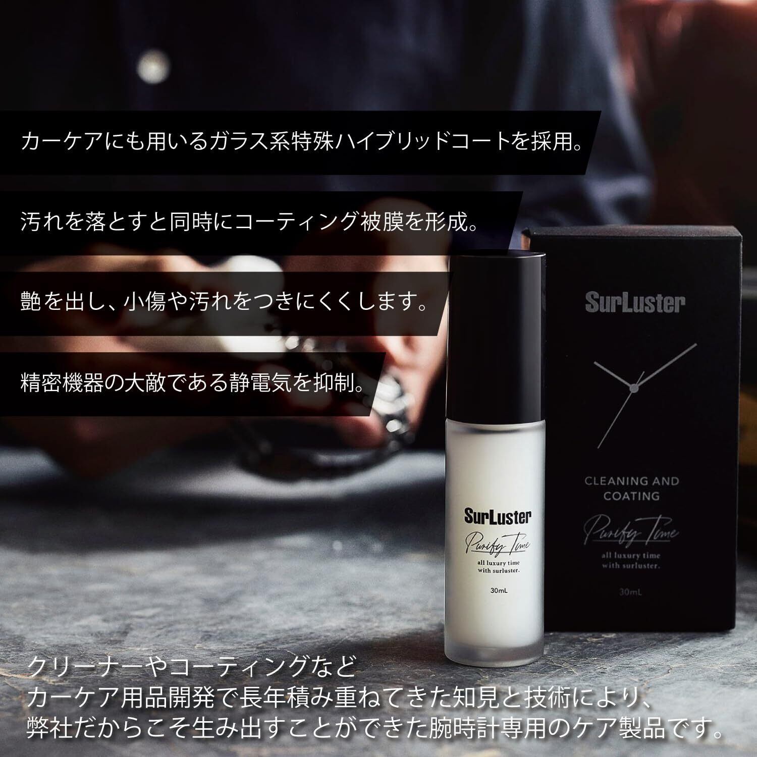 高品質なカーケアメーカーとして知られる創業1947年の老舗「シュアラスター」が開発。クリーナー・コーティングなど、カーケア用品開発で積み重ねた知見と技術をフルに活用しました。◆「ガラス系特殊ハイブリッドコート」が汚れを落としながらコーティング被膜を形成。時計を小傷や汚れから守り、艶を出します。◆「帯電防止剤」を配合することで精密機器の大敵である静電気を抑制します。