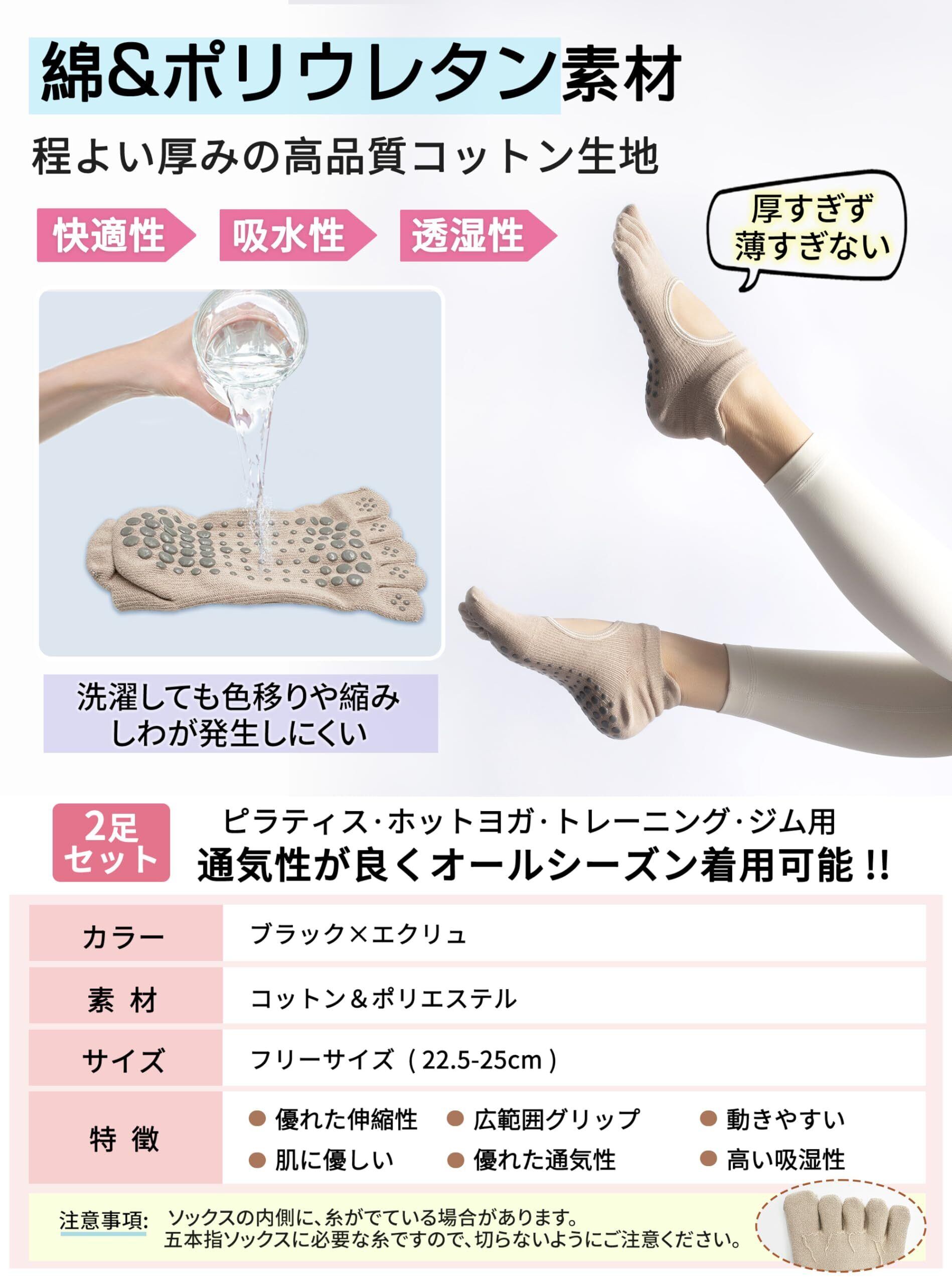 【5本足指が自由に動く】素足に近い感覚の5本指タイプで、どんなポーズにも対応できます。5足指を1本ずつ動かせるためふんばりがきき、ヨガやフィットネスでのパフォーマンスアップにつながります。5本指だから足を温めながらしっかりと地面をとらえバランスを保つことができます。足指の動きをサポートし、自然な感覚でトレーニングが可能。冷房や寒い季節の足の冷えから守ります。ニュアンスカラーのお洒落なグリップソックス。