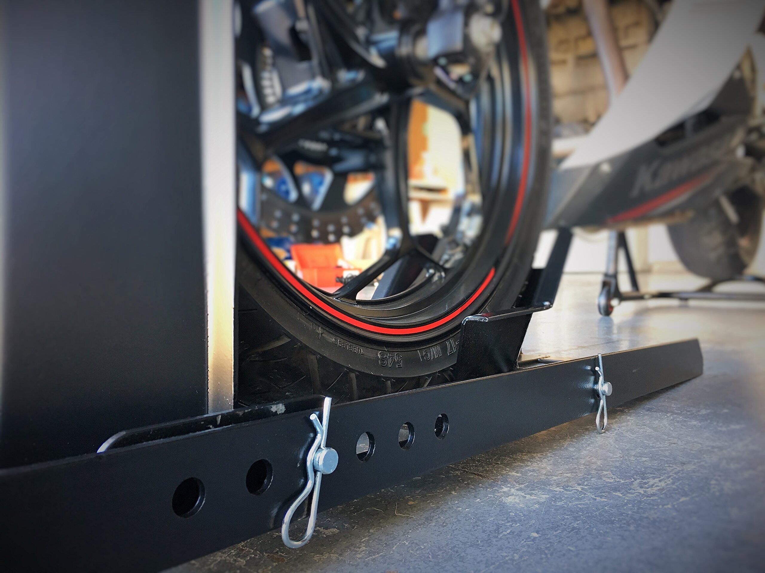 バイク用ホイールチョックスタンドは、15~22インチ (38~56cm) までのオートバイのフロントまたはリアのホイールサイズに対応しています。調整可能なホイールロッキングシステムを備えています。