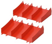 Jr.サーキットのストレートとカーブの間に組み込むことで、カーブセクションに20度の勾配をつけたコースレイアウトを作ることが可能。主要パーツは赤色なので7月に発売された「ジャパンカップ Jr.サーキット(レッド/ブルー/ホワイト)」にもよくマッチ。バンクアプローチ×2:ABS製/赤。カーブセクションを支えるアプローチ台:PP製/赤。連結ジョイント、エンドキャップ(各2):ABS製/赤。パイプ(長×2・短×1):ABS製/黒。カーブ用連結金具、取付用両面テープ袋詰め入。