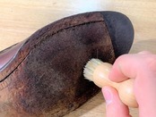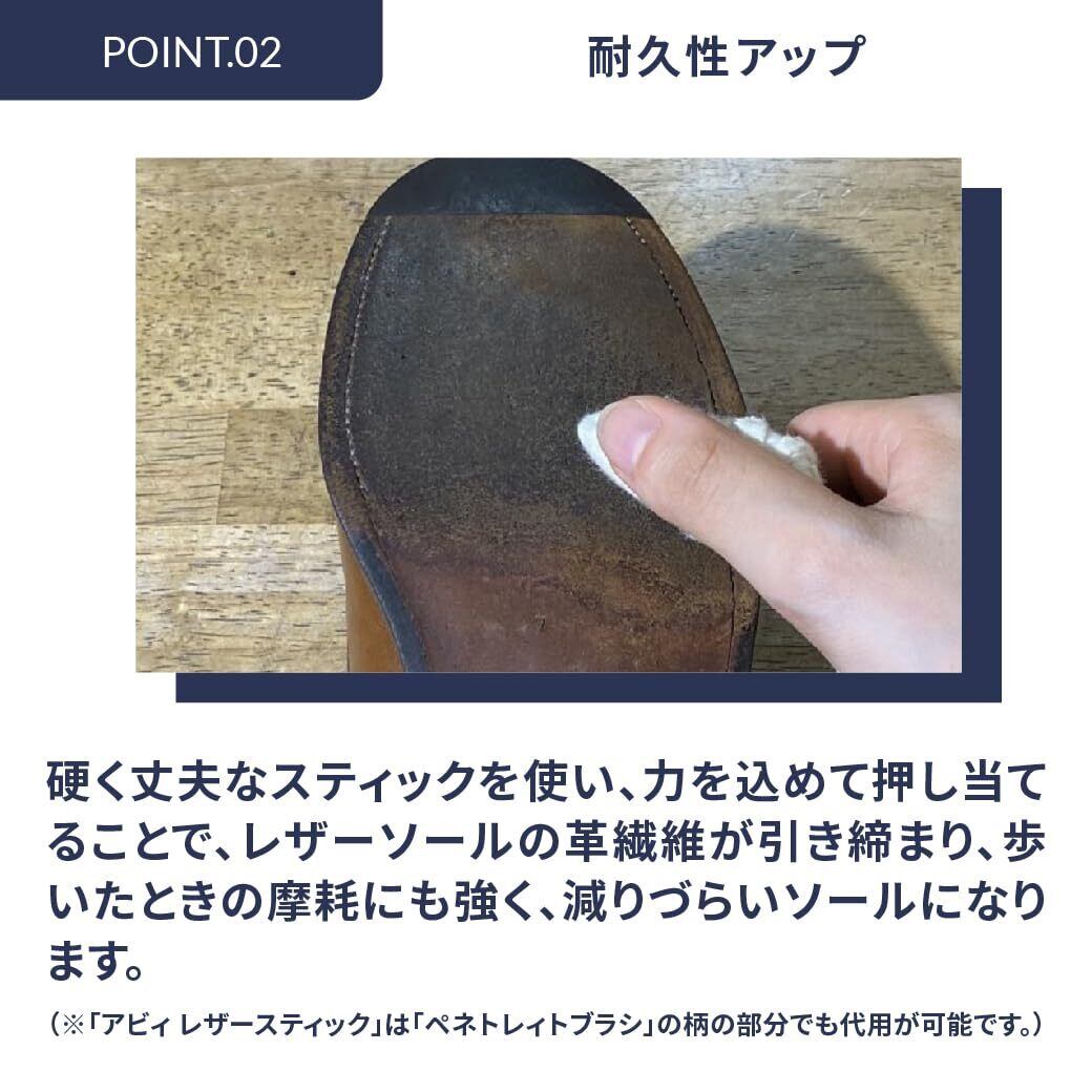 革は潤いがなくなると摩耗しやすくなり、特にレザーソールは地面と摩擦することで減りが早くなってしまいます。ソールモイスチャライザーはレザーソールを長持ちさせるための栄養クリームです。雨で塗れた後、乾燥して固まってしまったソールには特におすすめです。革底にソールモイスチャライザーを塗り込めば皮革の潤いが保たれて歩行時の返りが良くなります。ブラシ等で塗り込んだ後、【アビィ レザースティック】等の硬く面のあるもので擦ることで革に入り込んで栄養を与え、革底の潤いを保つことが出来ます。
