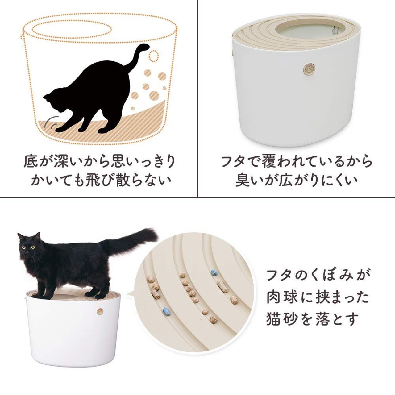縦型デザインと飛び散り防止凹凸ふたで、猫砂の飛び散りを解決する上から猫トイレです。