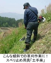 農家の皆さん、土手の草刈で足が滑ってお困りではありませんか?片足のみに取り付け、安全かつ楽に作業が出来る、まったく新しいスベリ止め用具です。 谷側の足のみ装着、踏ん張りがきき、楽に作業できます。 ●材質:鉄・マジックバンド ●使用角度:約35度前後 ●使用方法:ゴム長靴などにしっかり装着してください。装着は作業を始める傾斜面で座って行ってください。