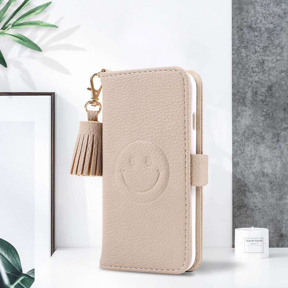 iPhone SE3 ケース手帳型 かわいい シンプル ケース 手帳型 おしゃれ iPhone 8 携帯カバー 高級レザー iPhone 6s 手帳ケース タッセル アイフォンse3 ケース手帳型 アイフォン8 ケース手帳がた smile 女性 SE2 携帯カバー 全面保護 防汚シェル 笑顔 iPhone 7 財布型 横置きスタンド機能付き 電話ケース (アプリコット)