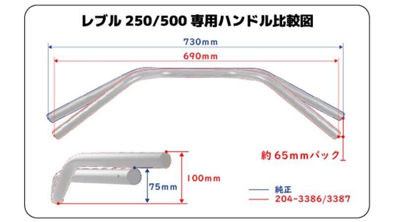 約65mm手前に来て、乗りやすくなるハンドルのレブル250/500用のハンドルです。
