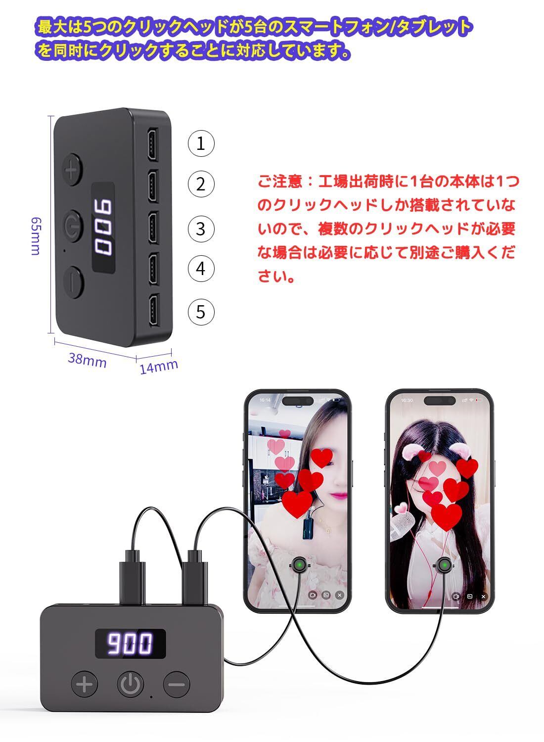 【多台使える】最大は5つのクリックヘッドが5台のスマートフォン/タブレットを同时にクリックすることに対応しています。 ご注意:工場出荷時に1台の本体は1つのクリックヘッドしか搭載されていないので、複数のクリックヘッドが必要な場合は必要に応じて別途ご購入ください。