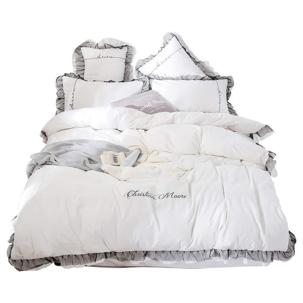 布団カバー シーツ 刺繍 蓮の葉 寝具カバーセット 掛け布団カバー ボックスシーツ 枕カバー ベッド用 布団用 洗い替え速乾タイプ(ホワイト A8, セミダブル・4点セット)