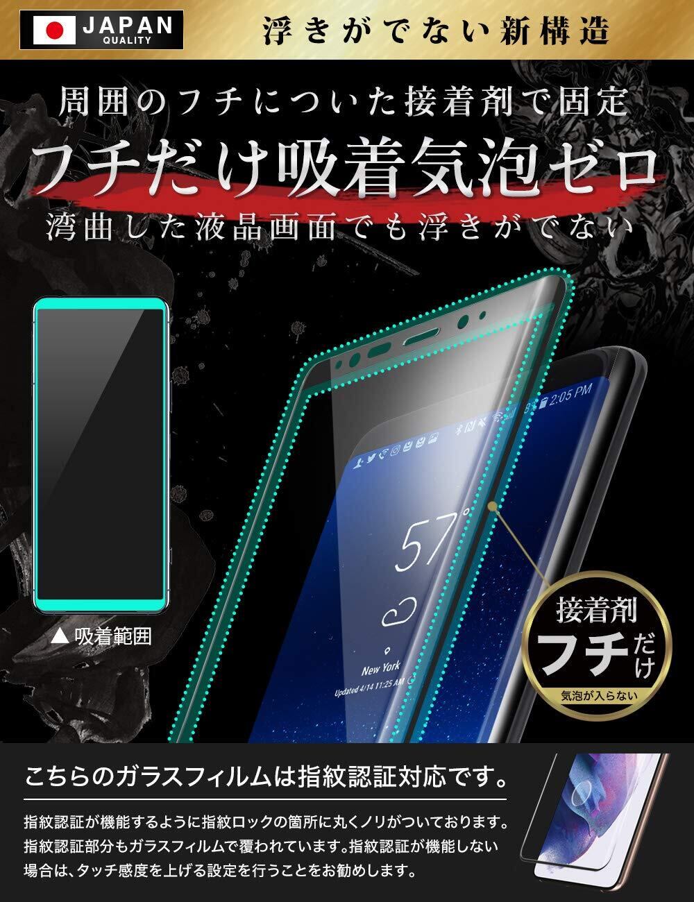 ガラスフィルム周囲および指紋認証部分のみにノリがついています。【目を守る特殊性能】ブルーライトをしっかりカットするので、手軽にブルーライト対策【最先端の第3世代技術】柔軟性と強度を兼ね備えた化学強化ガラスを採用。硬度10Hの高強度に加え、長期劣化に強い柔軟性をプラス。「より割れない」「より浮かない」「角割れしない」ガラスフィルムですが可能です。特に長時間スマートフォンを利用される方にお勧め