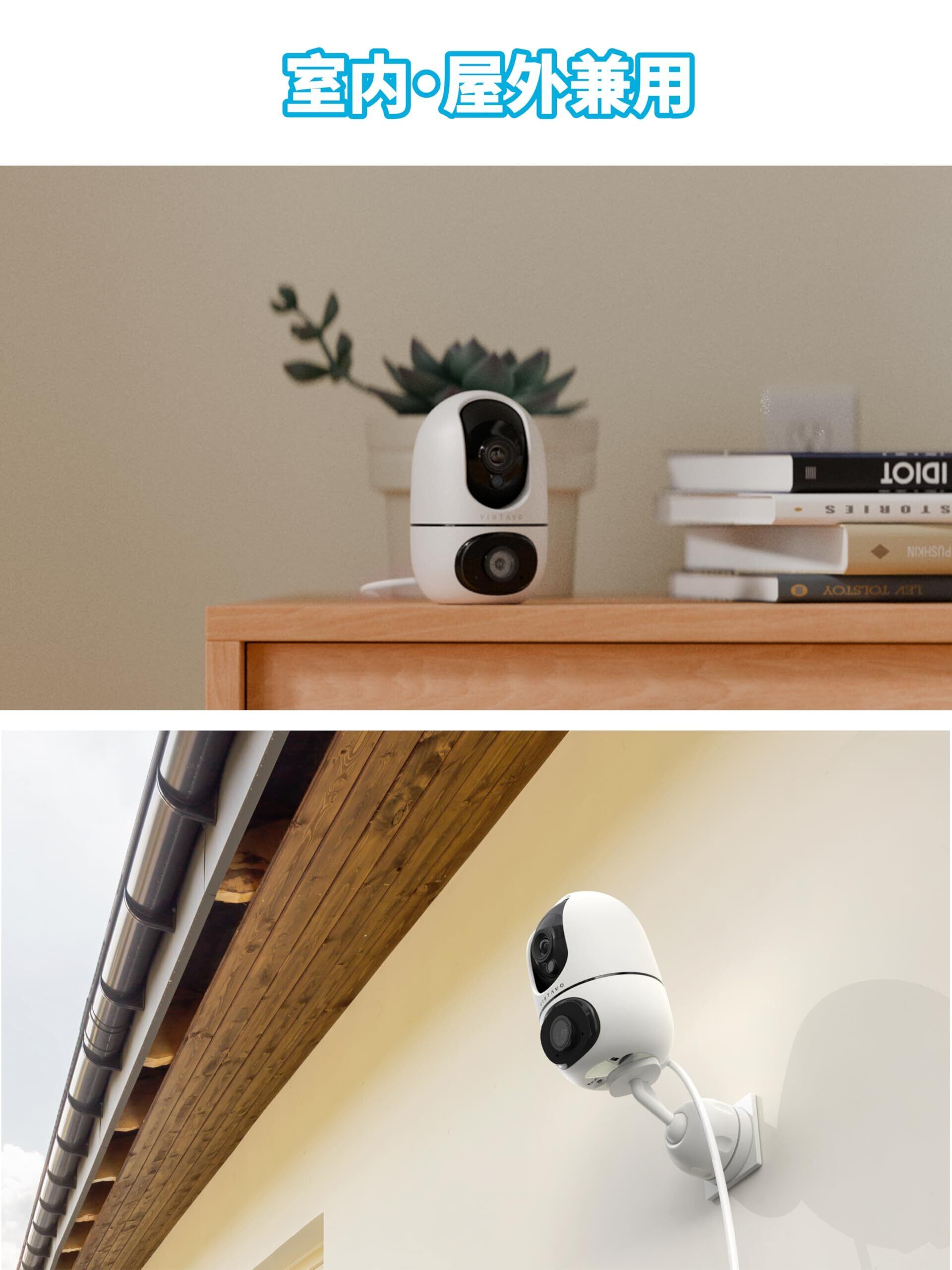 【2-in-1見守りカメラ・広範囲監視】この監視カメラは、2つのレンズを搭載し、2つの独立したエリアを監視可能。カメラ1はPTZ機能を備え、左右に300°回転、上下に65°回転可能。水平視野角82.3°、垂直視野角44.7°で、360°の監視を実現。カメラ2は水平視野角100.5°の超広角固定レンズで、垂直視野角は55.9°。お年寄りやお子様、ペットの見守りに最適!