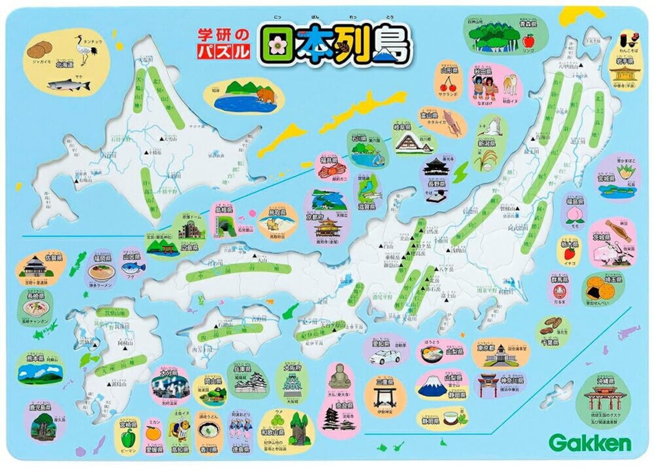 パズル遊びを楽しみながら都道府県の名前や形、位置などが自然に身につく!特産物や世界遺産などの情報が盛りだくさんの日本列島パズル。都道府県パズルはリバーシブルとなっていて、表は都道府県名と都道府県庁所在地の位置に赤丸、裏は都道府県庁所在地名。パズルを取りやすいように8ヶ所取り外し用の穴あき。パズルボードの表に特産物や世界遺産がイラストで紹介。パズルボードの底面に主な河川や山地などを紹介。パズルボードの裏面に8つの地方区分に色分けした日本列島がのっている。また都道府県名クイズ(6問)がのっているので楽しく挑戦!壁に貼れるA2サイズで地理の情報だけでなく、新幹線や鉄道や高速道路などの情報も満載!おかたづけ用袋にパズルがそのまま収納できて便利。【商品内容】都道府県パズル47枚、パズルボード1枚、日本全図(A2)1枚、おかたづけ用袋1枚