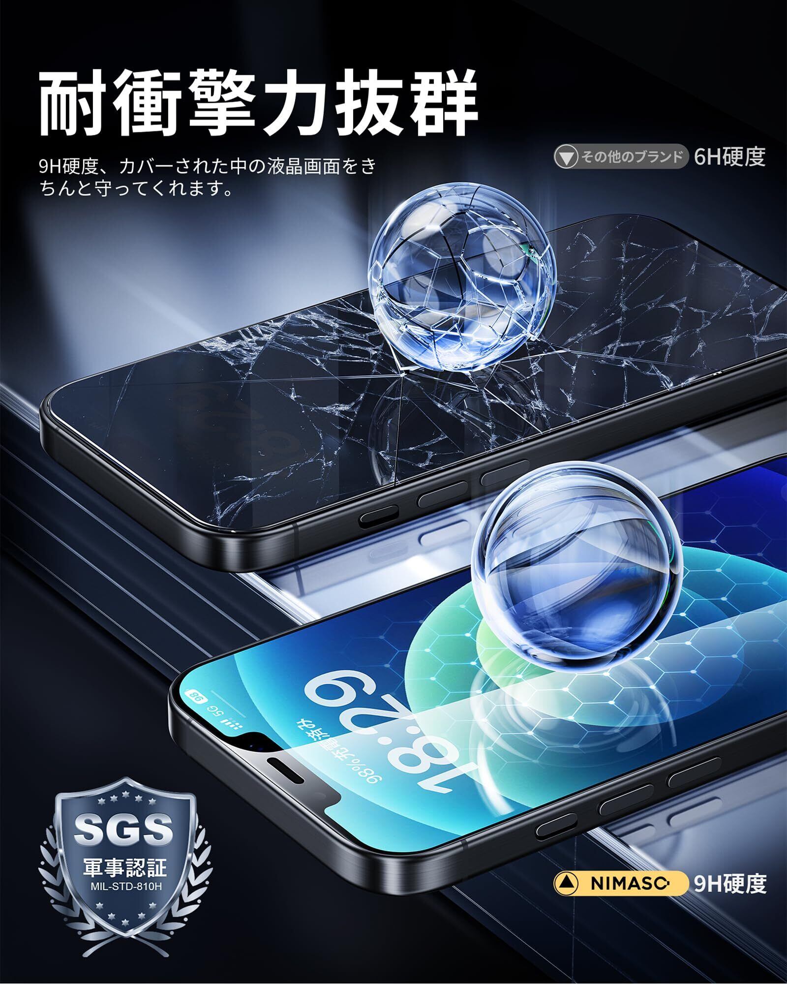 「9H硬度・飛散防止」米軍規格「MIL-STD-810H」に準拠(認証番号:SZXEC23002005001)。9H硬度のガラスを採用。小刀や鍵などの鋭いものにぶつかっても傷が付きにくく、アイホン12をしっかり保護します。飛散防止加工により、万一割れてもガラス破片が飛び散ることなく安心です。