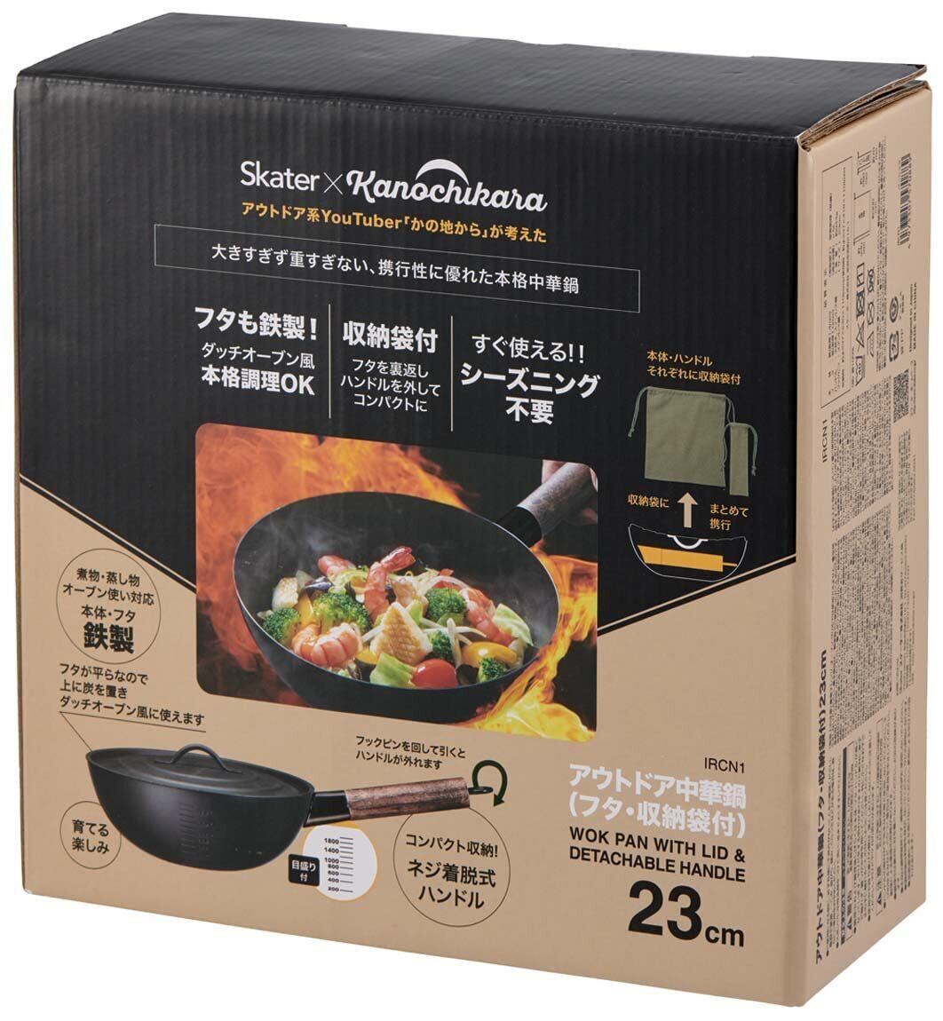 スケーター(Skater) アウトドア用 取っ手の取れる 中華鍋 23cm フタ 収納袋付 シーズニング不要 空焚き不要 キャンプ用フライパン かの地から アウトドア用中華鍋 IRCN1-A
