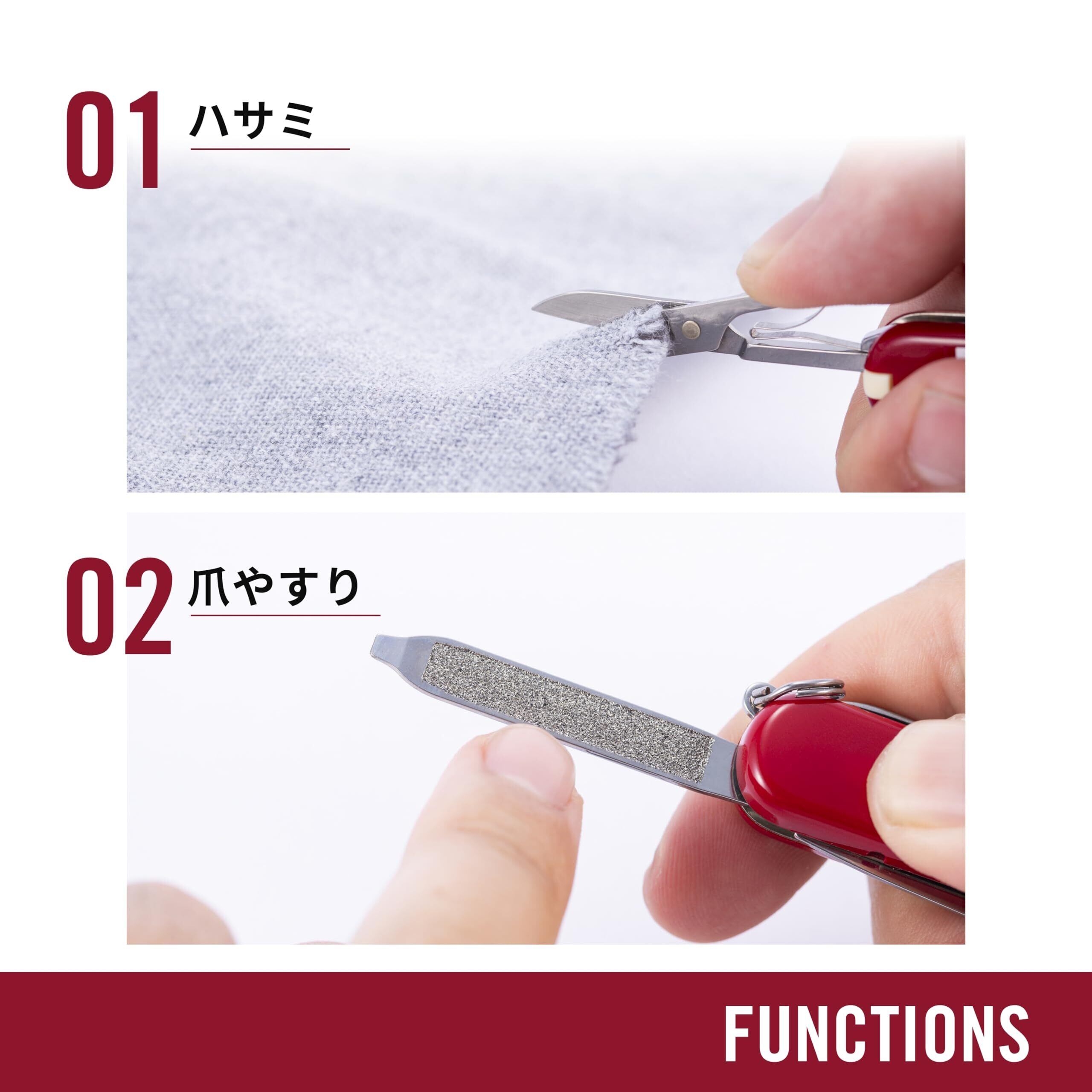 7機能: スモールブレード(小刃)、はさみ、つめやすり、マイナスドライバー(小)、トゥースピック(つまようじ)、ピンセット、キーリング