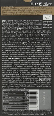 原材料 有機カカオマス(パナマ産)、有機カカオバター(ドミニカ共和国・ペルー・タンザニア産)、有機ココナッツシュガ ー(インドネシア産)