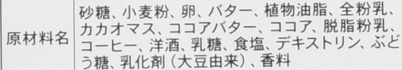 小麦粉、砂糖、卵白、バター、準チョコレート(植物油脂、砂糖、ココアパウダー、全粉乳、カカオマス)、チョコレート(砂糖、ココアバター、全粉乳、カカオマス、植物油脂、乳糖、脱脂粉乳)、ショートニング、コーヒークリーム、乳等を主要原料とする食品、植物油脂、カカオマス、ソフトクリームパウダー、コーヒーチョコレートコーチング、洋酒、インスタントコーヒー、食塩 / 乳化剤、香料、着色料(カロテノイド)、(一部に、小麦・乳成分・卵・大豆を含む)