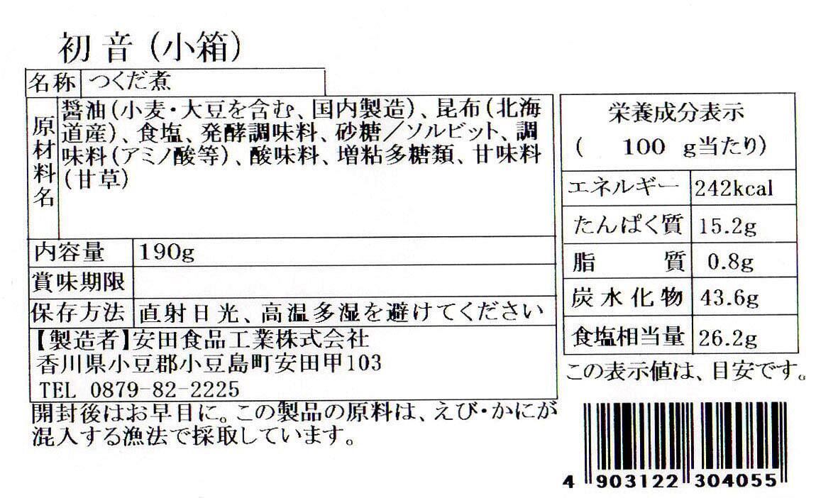 角切りにした北海道産昆布を、小豆島で醸造された醤油で煮上げ乾燥し、塩味に味付けしました。粉末の昆布茶が多い中、「初音」は昆布の素材を活かして製造しました。昆布の旨みがぎゅっとつまった「初音」は、飲んだ後の昆布も残さず食べられます。お湯(約80cc)にお好みで2~3枚入れてお召し上がりください。専用の化粧箱に入っていますので、贈り物や手土産にも最適です。 【栄養成分表示(100g当たり)】エネルギー242kcal、たんぱく質15.2g、脂質0.8g、炭水化物43.6g、食塩相当量26.2g この表示値は、目安です。