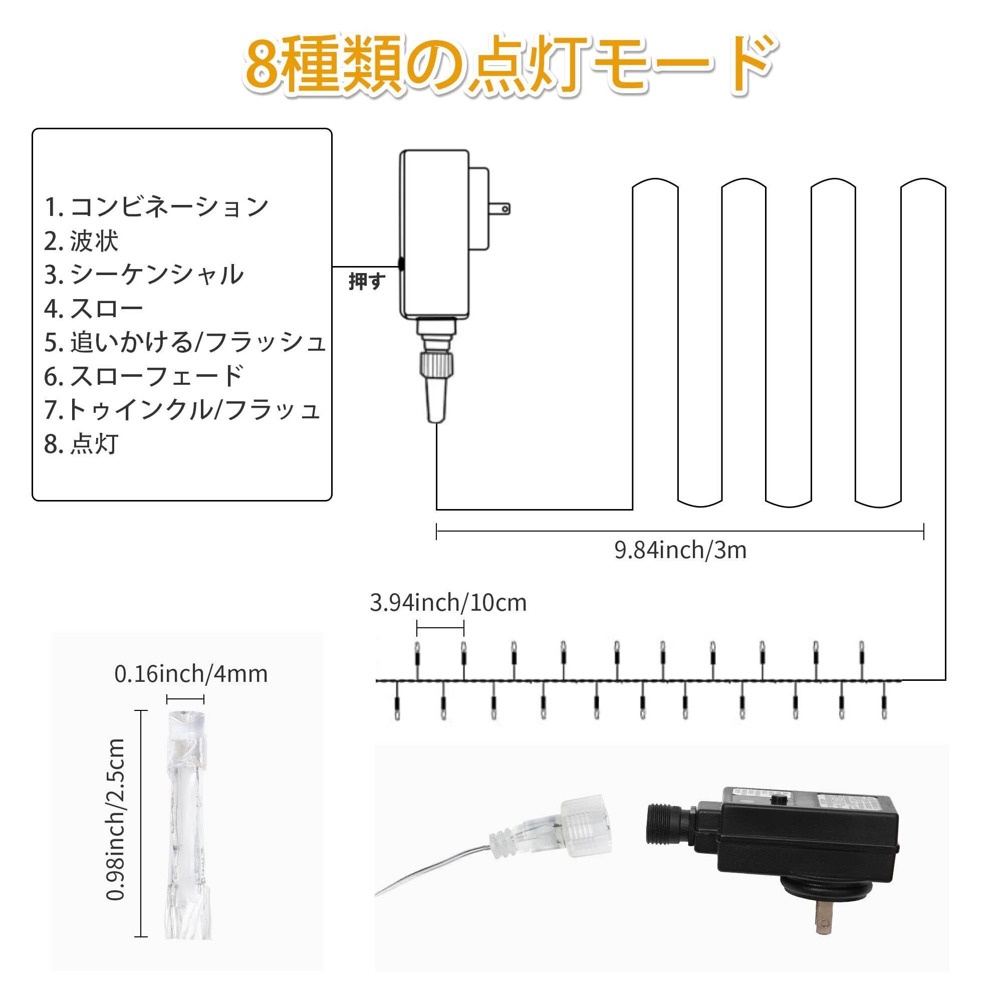 IP44防水レベル:イルミネーションライトは屋外で使用され、水滴飛散に耐えることができます。そのため、雨の日でも安全に使用できます。プラグは屋内で使用される必要があり、水に浸してはならないです。ご注意ください