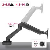 クランプは0.5-9㎝の厚さの机に設置可能です。 アームは机接地面から直接伸びており 最高51cm、最長66cmまで伸びます。 アームの関節部分は360度回転が可能、自由自在にモニターの位置を変えることができます。VESAは360度横回転が可能、左右に傾け可能で、上に85度、下に90度傾けることが可能です。 画像を参照してください。(VESA アームとモニターの設置部分)
