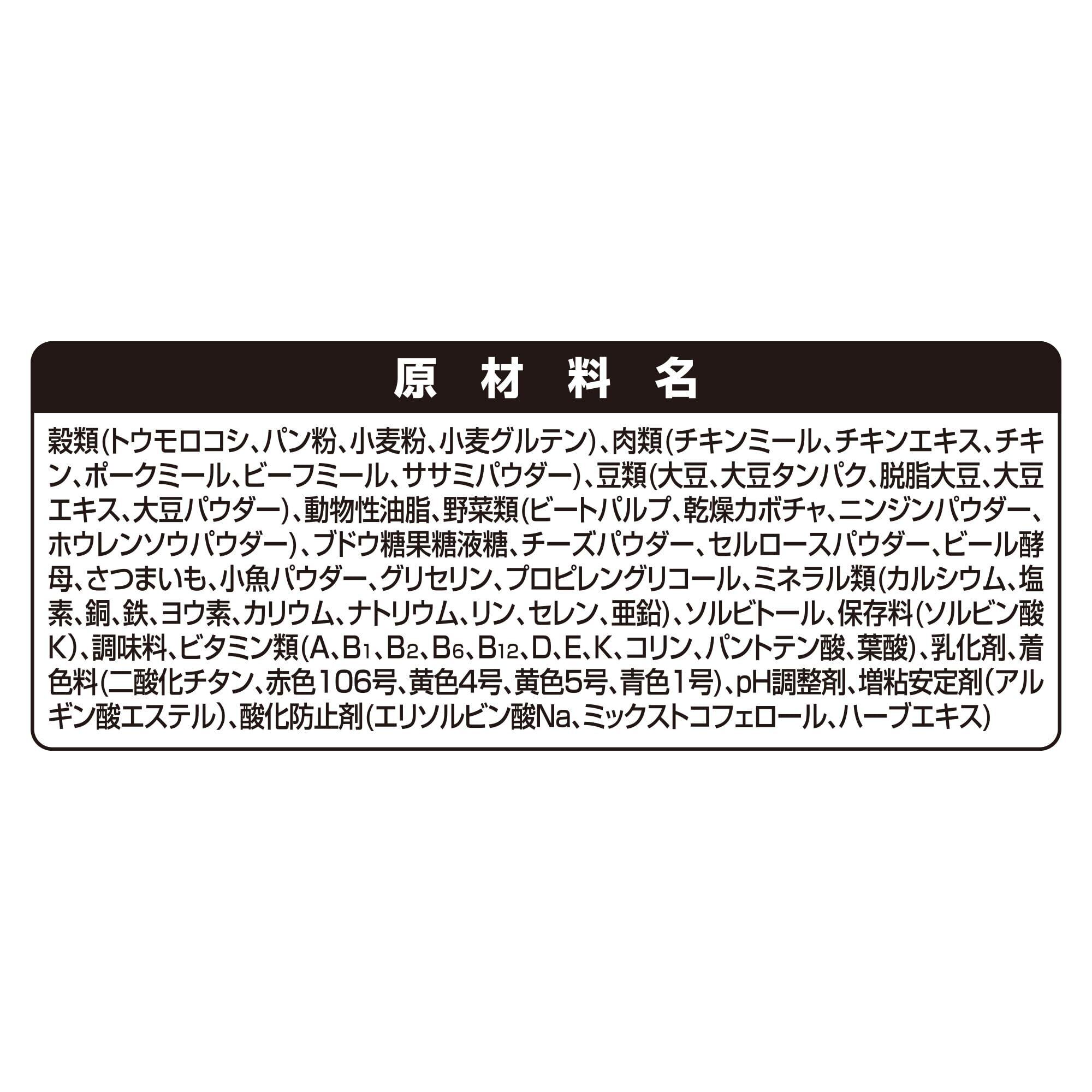 【原材料(成分)】穀類(トウモロコシ、パン粉、小麦粉、小麦グルテン)、肉類(チキンミール、チキンエキス、チキン、ポークミール、ビーフミール、ササミパウダー)、豆類(大豆、大豆タンパク、脱脂大豆、大豆エキス、大豆パウダー)、動物性油脂、野菜類(ビートパルプ、乾燥カボチャ、ニンジンパウダー、ホウレンソウパウダー)、ブドウ糖果糖液糖、チーズパウダー、セルロースパウダー、ビール酵母、さつまいも、小魚パウダー、グリセリン、プロピレングリコール、ミネラル類(カルシウム、塩素、銅、鉄、ヨウ素、カリウム、ナトリウム、リン、セレン、亜鉛)、ソルビトール、保存料(ソルビン酸K)、調味料、ビタミン類(A、B1、B2、B6、B12、D、E、K、コリン、パントテン酸、葉酸)、乳化剤、着色料(二酸化チタン、赤色106号、黄色4号、黄色5号、青色1号)、pH調整剤、増粘安定剤(アルギン酸エステル)、酸化防止剤(エリソルビン酸Na、ミックストコフェロール、ハーブエキス)【成分】タンパク質21.0%以上、脂質10.0%以上、粗繊維4.5%以下、粗灰分8.5%以下、水分13.0%以下【エネルギー】約355kcal/100g