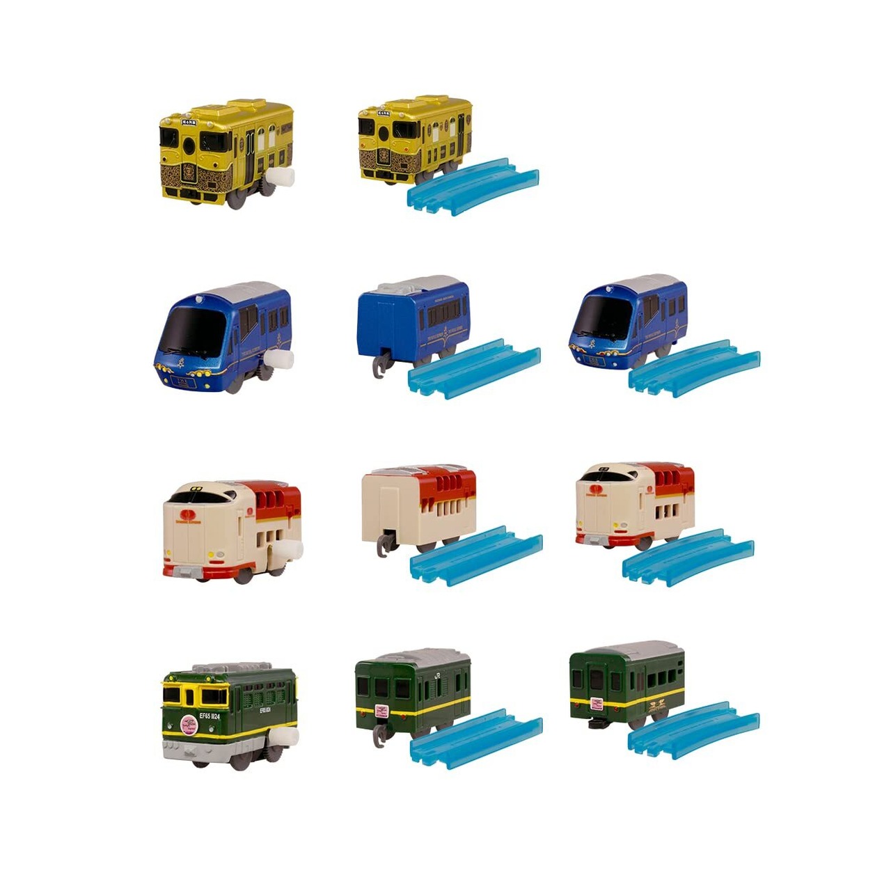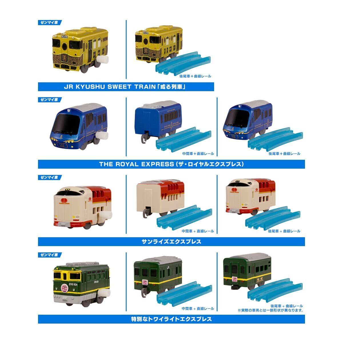 ● JR KYUSHU SWEET TRAIN 「或る列車」 先頭車(ゼンマイ車) 後尾車+曲線レール ● THE ROYAL EXPRESS(ザ・ロイヤルエクスプレス) 先頭車(ゼンマイ車) 中間車+直線レール 後尾車+曲線レール ● 特別なトワイライトエクスプレス 先頭車(ゼンマイ車) 中間車+直線レール 後尾車+曲線レール ● サンライズエクスプレス 先頭車(ゼンマイ車) 中間車+直線レール 後尾車+曲線レール の11種類のセット です。