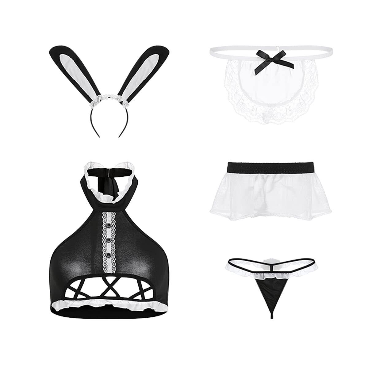 セット内容:トップス+Tバック+エプロン+ウサ耳+腕リング+ストッキング 6点セット