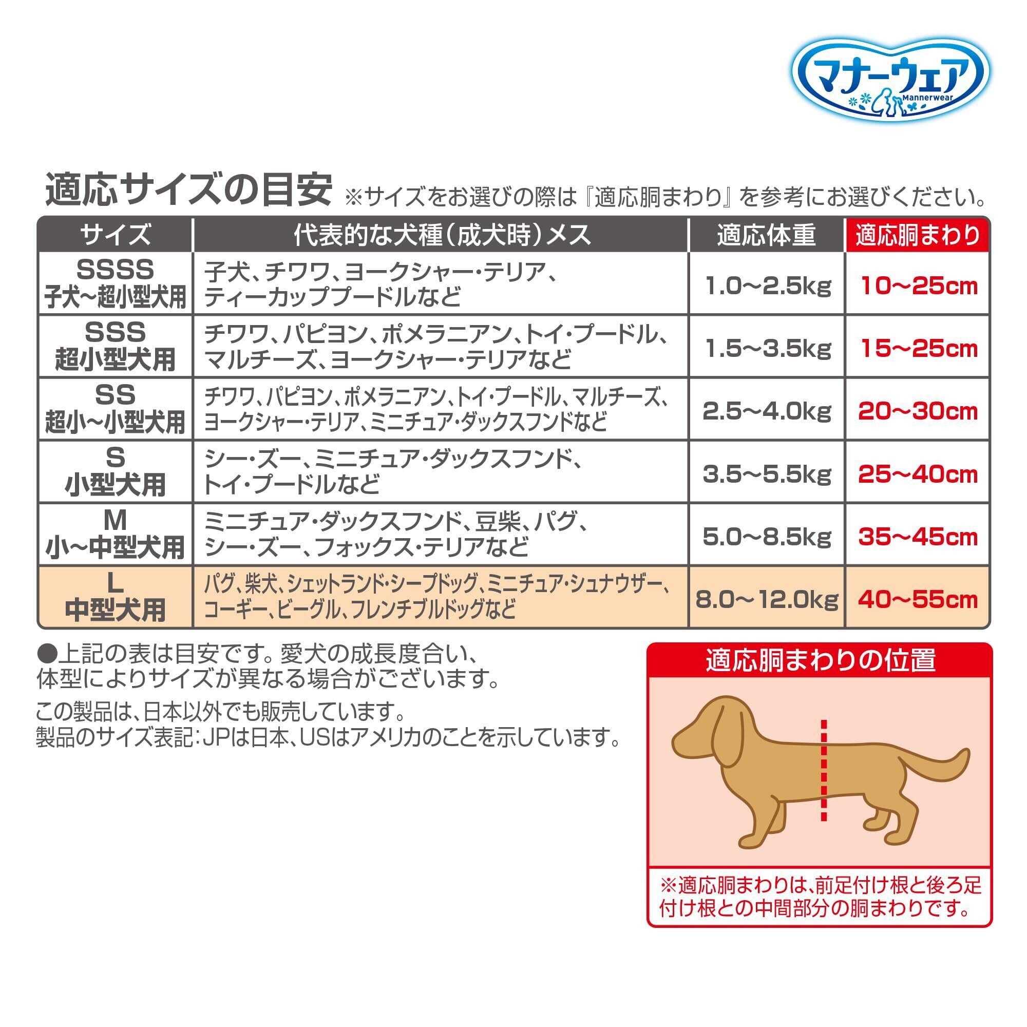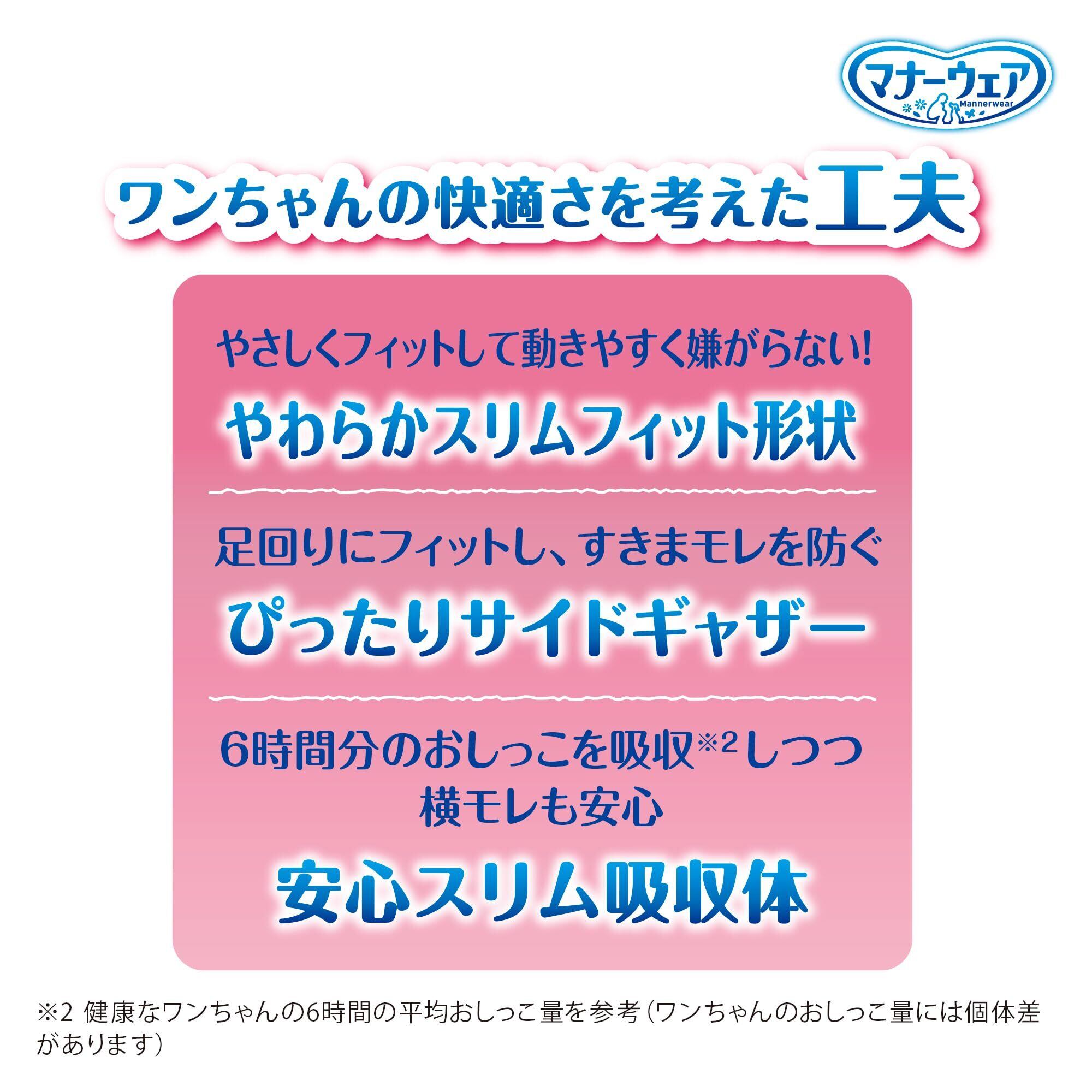 ■やわらかスリムフィット形状&のび~るフィットギャザー 元気に動きまわるワンちゃんでも動きやすく嫌がらない! ■ふわさら吸収シート&やわらか前面通気シート ムレを防いで肌さらさら ■ぴったりサイドギャザー&安心スリム吸収体 足まわりにぴったりフィットし、すきまモレ安心&6時間分のおしっこを吸収* (*健康なワンちゃんの6時間の平均おしっこ量を参考/おしっこ量には個体差があります。) ■つけ直しラクラクテープ 簡単装着&動き回っても外れにくい ■オシッコモレを防ぐ、大きさ調整可能なしっぽ穴 しっぽ穴のサイズは、しっぽの大きさに合わせて2段階に調整可能 ■2種類のかわいいデザイン ワンちゃんとのお出かけがもっと楽しい気分に洋服とのコーディネイトもOK