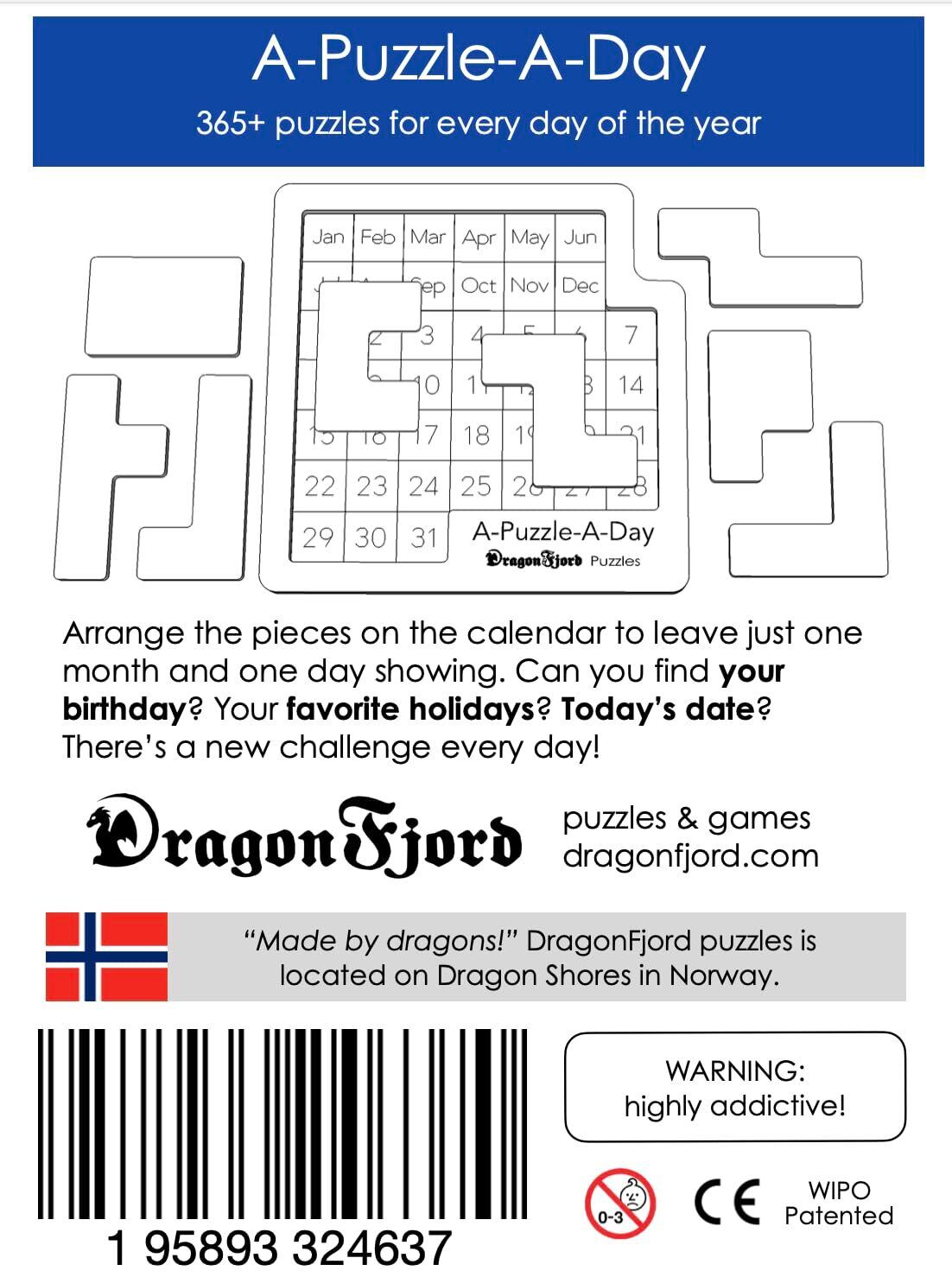 オリジナルのA-Puzzle-A-Dayは、毎日新しい挑戦を伴う、信じられないほど楽しくて中毒性のあるパズルです。 8つのピースをカレンダーフレームに収めて、月と日をひとつずつ表示するだけです。 ご自分の誕生日を見つけられますか? お気に入りの休日は? 記念日は? 今日の日付は? 毎日が新しいパズルです! A-Puzzle-A-Dayは、友人、家族、同僚、自分自身への素晴らしい贈り物になります! A-Puzzle-A-Dayは再生木材繊維を使用し、「フィヨルドの火で鍛造」されています。わずかに焼け焦げた跡があり、それはひょっとしたらドラゴンによって作られた証拠かもしれません。 DragonFjordのパズルはノルウェーでトロンヘイムス・フィヨルドのドラゴンショアでデザイン・製造されています。 何度でも遊べて、何年も長持ちするパズルです。 ご注意: このパズルは非常に中毒性があります!