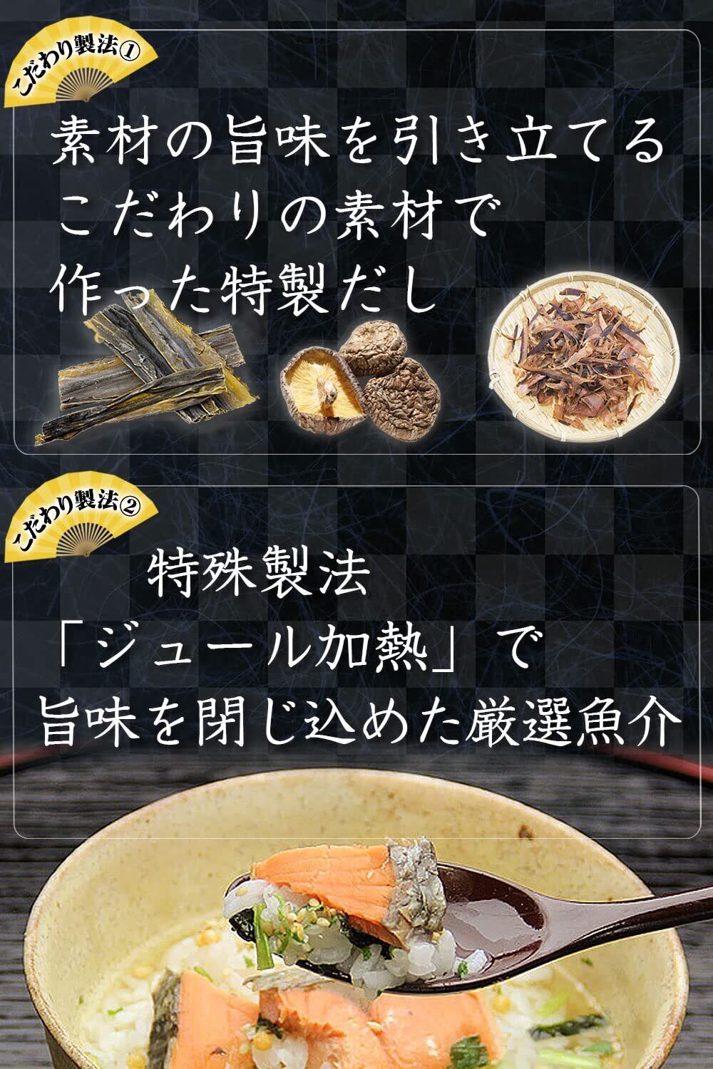 特殊製法「ジュール加熱」で旨みを閉じ込めた存在感のある具材と素材の旨味を引き立てるこだわりの特製調味だし。自宅で簡単・手軽に料亭のような贅沢茶漬がお召し上がりいただけます。一度食べたら手放せない美味しさの本格生茶漬けをぜひご賞味ください!