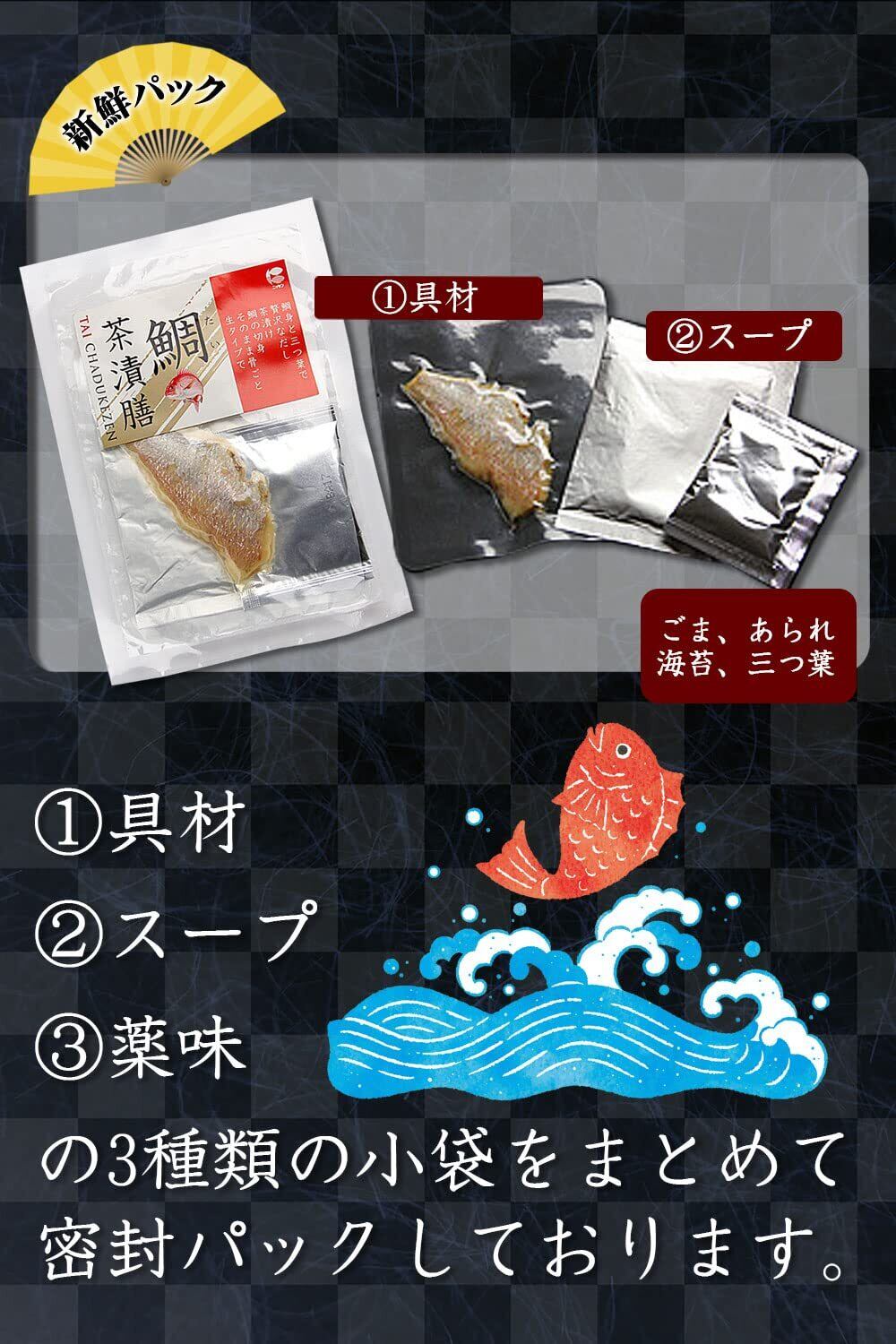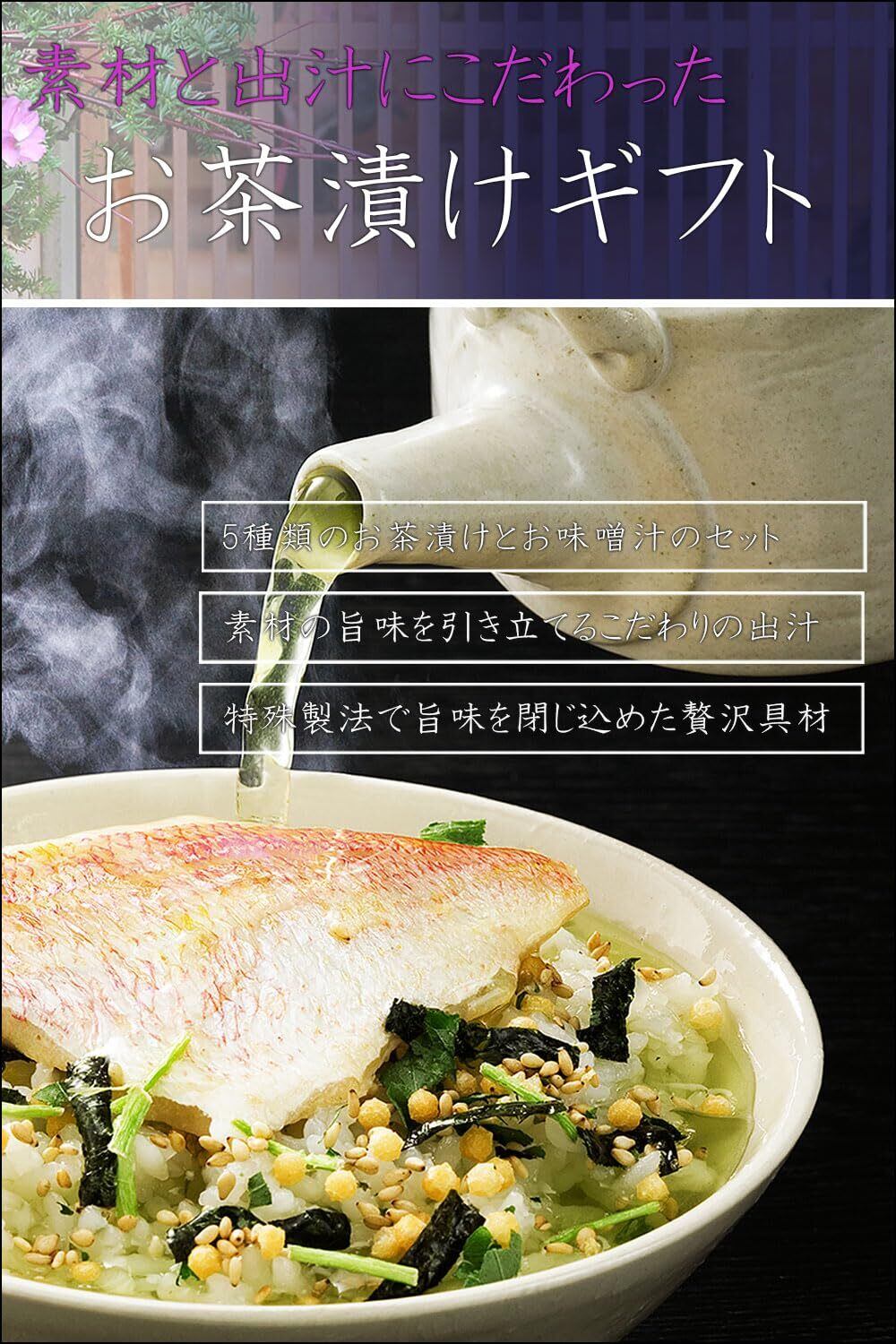 内容:鯛茶漬け、鮭茶漬け、たらこ茶漬け、ふぐ茶漬け、はまぐり茶漬け、お味噌汁1袋(はまぐり or しじみ汁)※季節によってお茶漬けの具材の内容が変更となる場合がございます事をご了承ください。