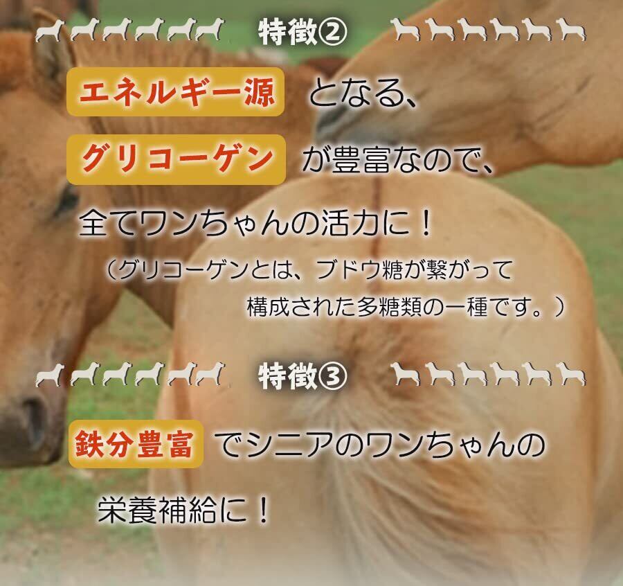 【原材料】馬肉【栄養成分】粗タンパク質70.0%以上 粗脂肪6.0%以上 粗繊維0.1%以下 粗灰分3.5%以下 水分10.0%以下 100g当たりエネルギー 379kcal