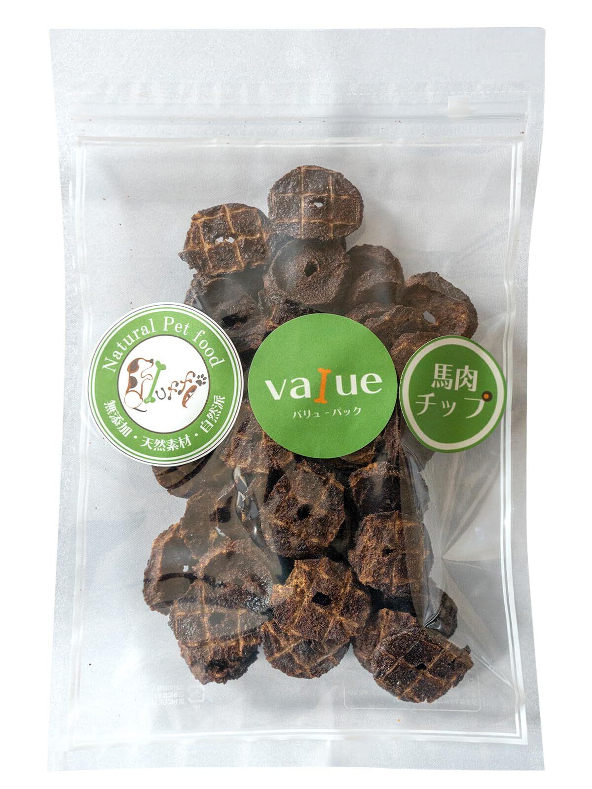 馬肉ジャーキーチップ。豚肉や牛肉等に比べ脂質 が少なく高たんぱくだから愛犬のダイエットに。